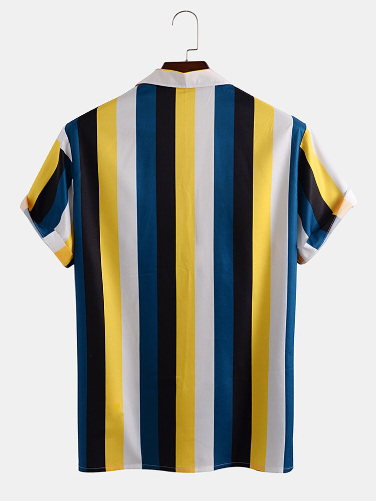 Mens Wide Striped Revere Collar Short Sleeve Shirts – Yellow M