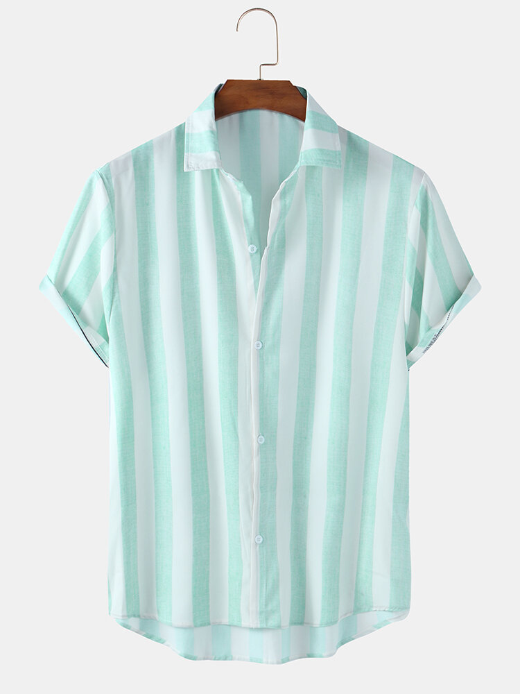 Mens Wide Striped Turn Down Collar Short Sleeve Shirts – Blue 2XL