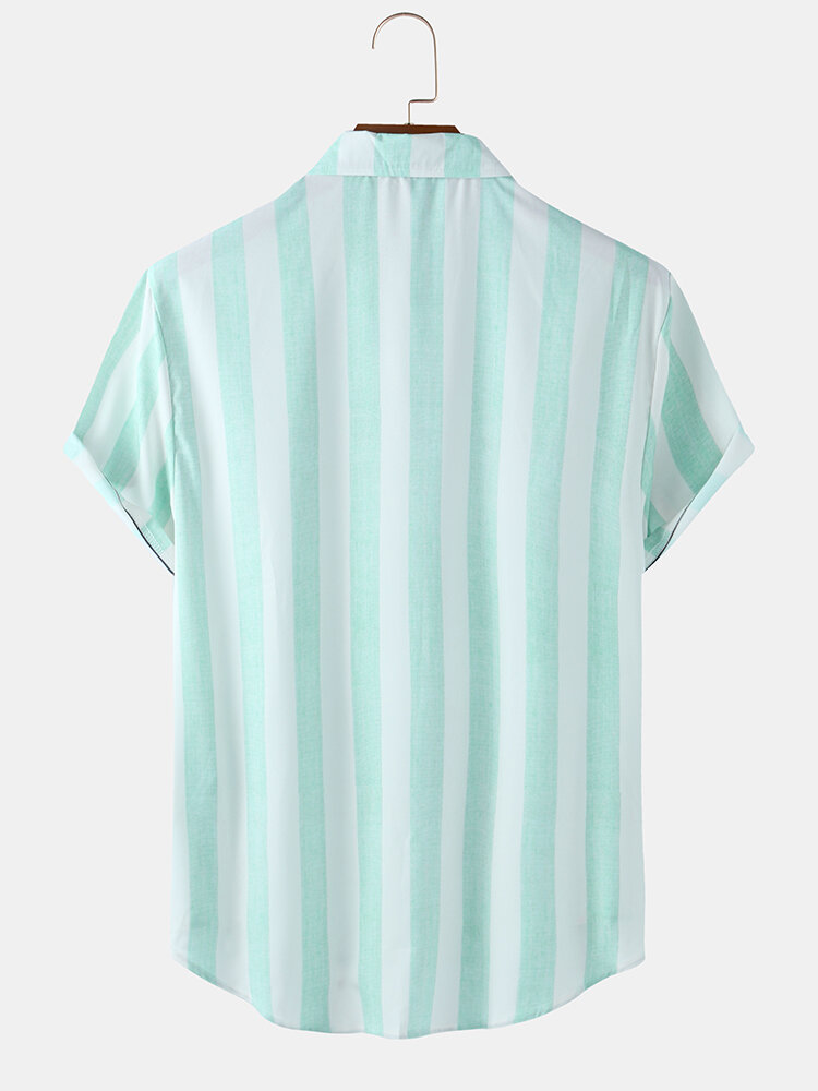 Mens Wide Striped Turn Down Collar Short Sleeve Shirts – Blue 2XL