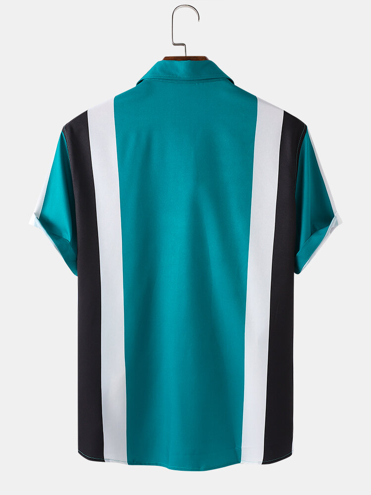 Mens Wide Striped Turn Down Collar Short Sleeve Shirts – Green S