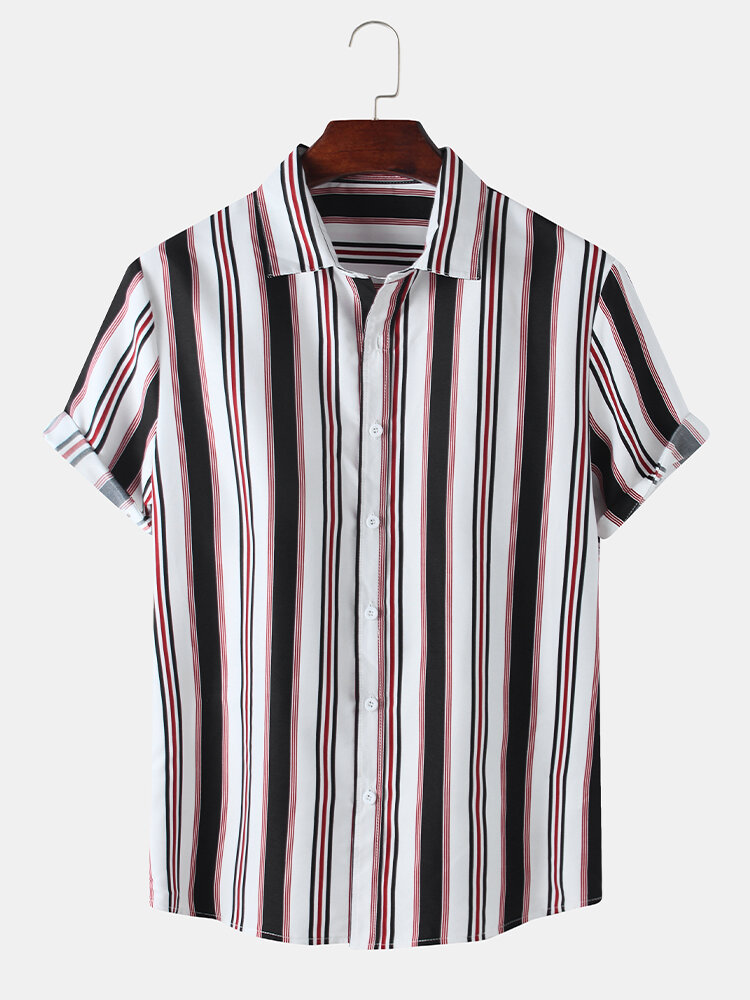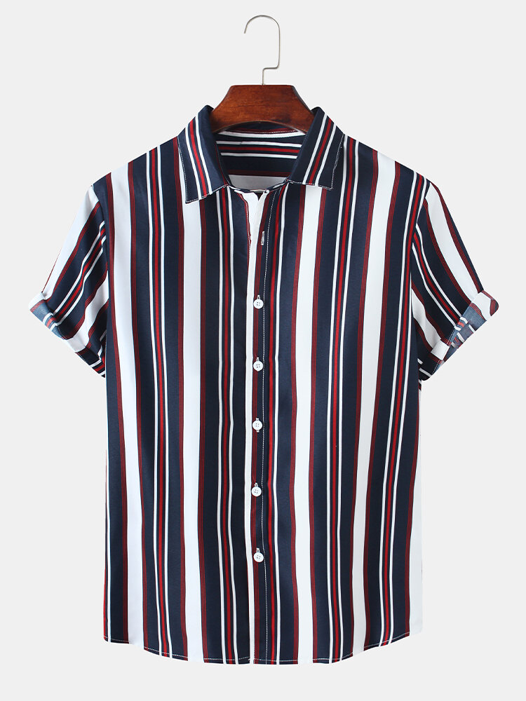 Mens Wide Striped Turn Down Collar Short Sleeve Shirts – White M