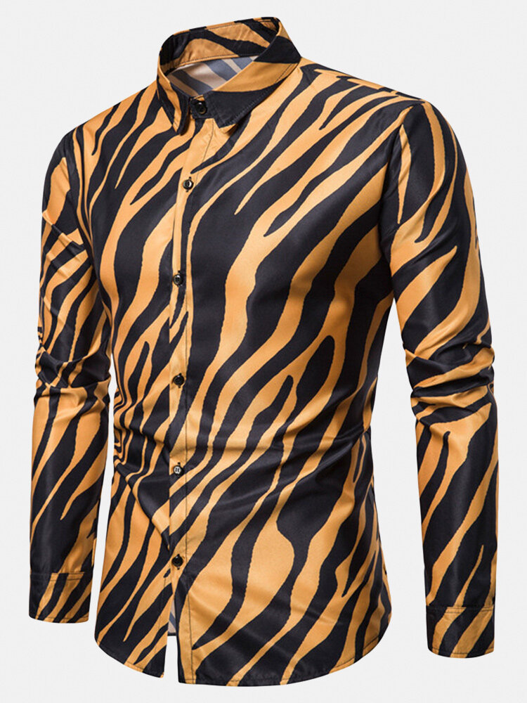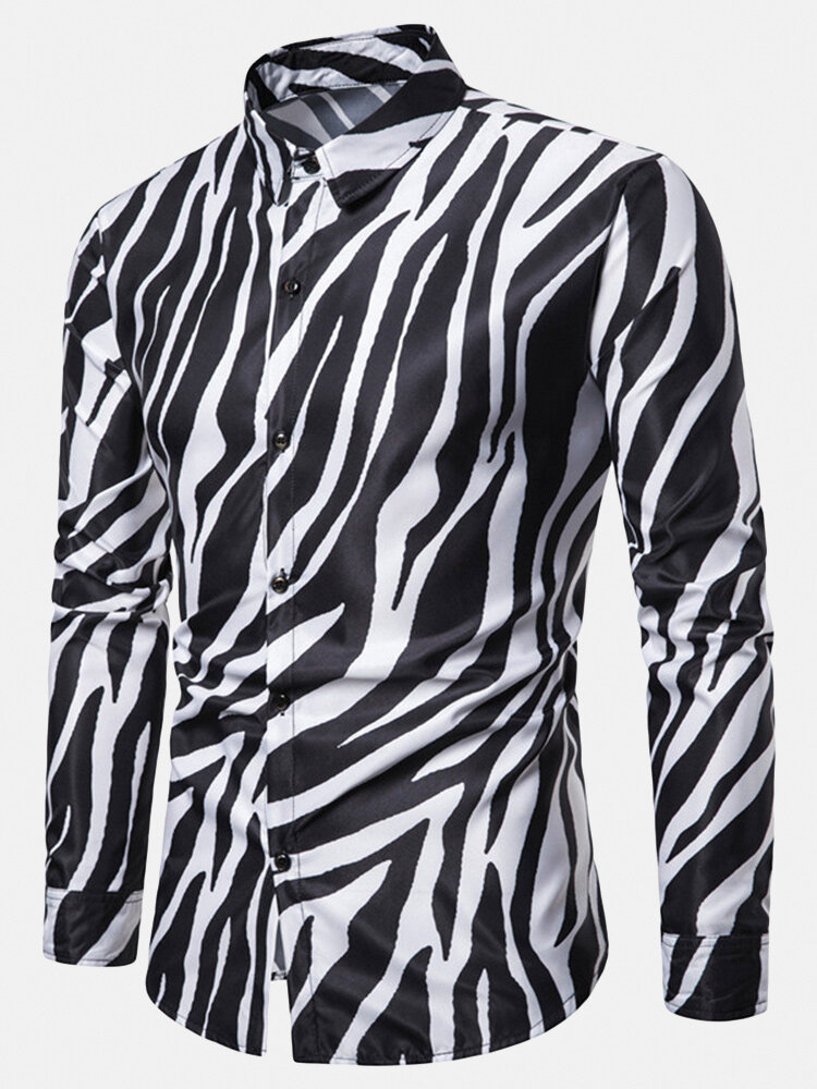 Mens Zebra Pattern Print Stylish Lapel Relaxed Fit Long Sleeve Shirts – White XL