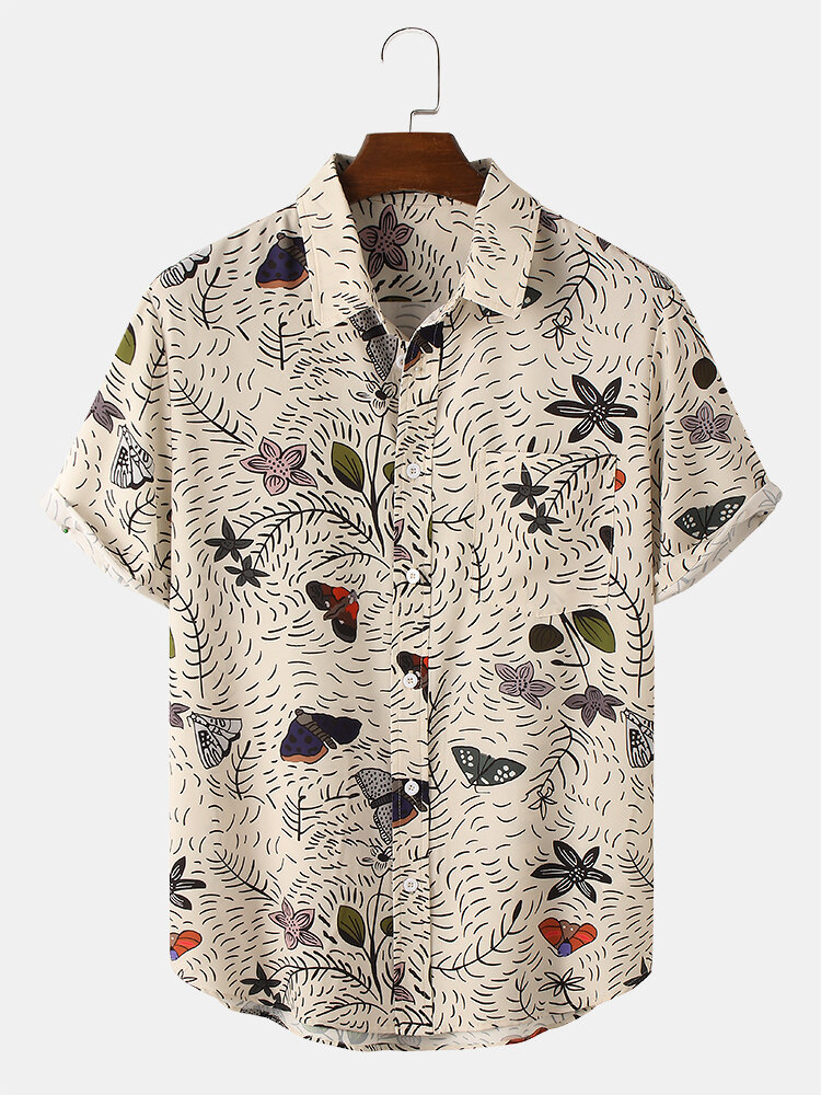 Mes Flower Butterfly Print Lapel Short Sleeve Shirt – Apricot S