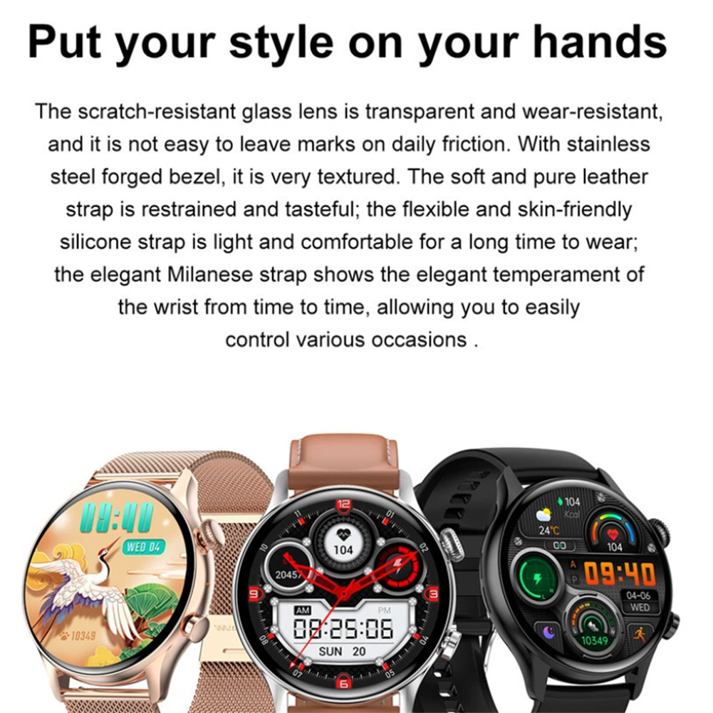 --Pay attention to your health: heart rate/blood oxygen/blood pressure monitor, sleep tracker, sedentary reminder, period tracker.--A good helper for exercise: steps, distance, calories burned, exercise mode.--Good helper in daily life: NFC access control, Bluetooth-compatible phone, synchronization notification, voice assistant, lock screen password, custom face, weather, music control, etc.--System requirements: compatible for Android 4.4 and above/iOS 9.0 and above.--Size: 44.8x44.8x11mm.