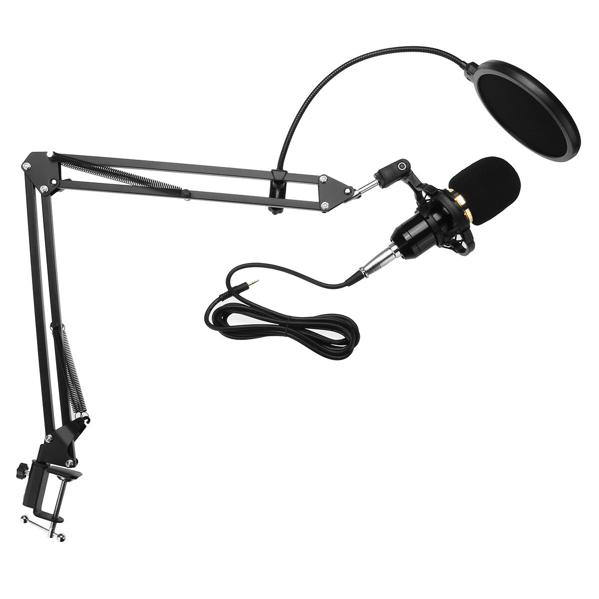 . Fonctionnalites: 1.Microphone e condensateur professionnel de qualite superieure pour rendre les enregistrements plus colores qui sonne aussi bien sur votre bureau que dans un studio d'enregistrement professionnel. 2.Le support antichoc dispose d'un reglage d'angle avec bouton de verrouillage et peut reduire efficacement le bruit de manipulation. 3.Le capuchon en mousse anti-vent peut proteger le microphone contre les interferences du vent et la broche des chanteurs. 4.Ideal pour le studio de radiodiffusion, la diffusion professionnelle, le studio de voix off, les scenes, les stations de television, la musique, Skype, les messages, Face Time, Twitch, YouTube, etc. Caracteristiques: - Materiel: metal - Tension de fonctionnement: 1.0V ~ 10V - Directivite: unique - Frequence de reponse: 10Hz-18000Hz - Sensibilite: -42 dB e 3dB (1,5 V, 680 KO : 0 dB + 1 V / Pa, 1 KHz) - Impedance de charge: