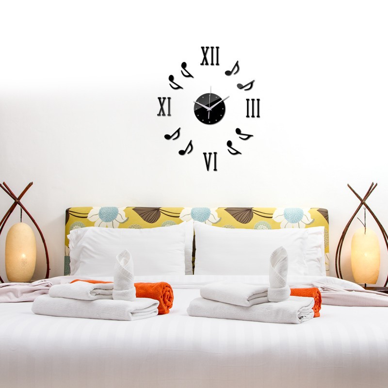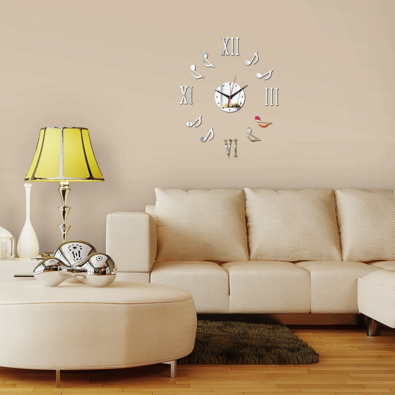 Modern DIY 3D Music Note Mirror Surface Wall Clock Art Sticker for Home Office Decor Silver