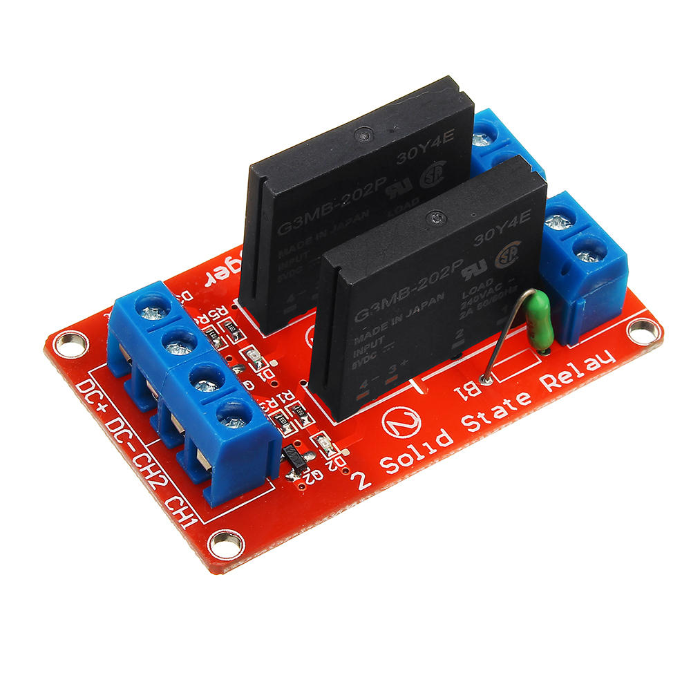 . La description: Relais statiques Omron 5V 240V / 2A, sortie avec fusible resistif 240V / 2A. Dimensions: 55x33x25 (longueur x largeur x hauteur) Puissance d'entree: 5VDC Tension d'entree du signal de commande: (relais d'etat bas 0-2,5 V active) (relais d'etat haut 3-5 V desactive) Fonctionnalite: Tension: 5 V Courant de repos: 0 mA Courant de fonctionnement: 12,5 mA Tension de declenchement: 3,3-5 V Courant de declenchement: 2mA DC +: alimentation positive (en fonction de la tension d'alimentation du relais) DC-: alimentation negative CH1: fin de declenchement du signal du module relais (bas pour declencher actif) CH2: fin de declenchement du signal du module de relais (bas pour declencher actif) Emballage inclus: 5 x module de relais e semi-conducteurs bidirectionnel pour
