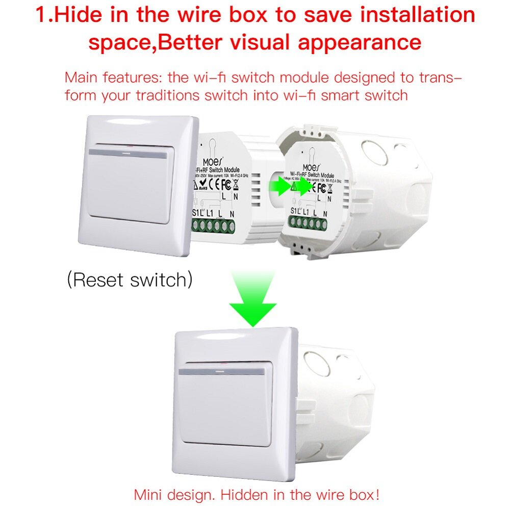 1.Ce module wifi intelligent avec mini design convient au boetier d'interrupteur mural UE / Royaume-Uni et cachez-le facilement dans votre boetier d'interrupteur mural cache de votre interrupteur traditionnel sans aucune influence sur votre style de decoration d'origine pour le rendre intelligent, donnant e vos appareils le nec plus ultra allumez / eteignez le relooking intelligent et convertissez la plupart des produits compatibles en produits intelligents.Plus important encore, votre commutateur traditionnel et ce module intelligent peuvent fonctionner independamment en mode sans interference. (Re : ce module convient aux interrupteurs e bascule et de reinitialisation.)