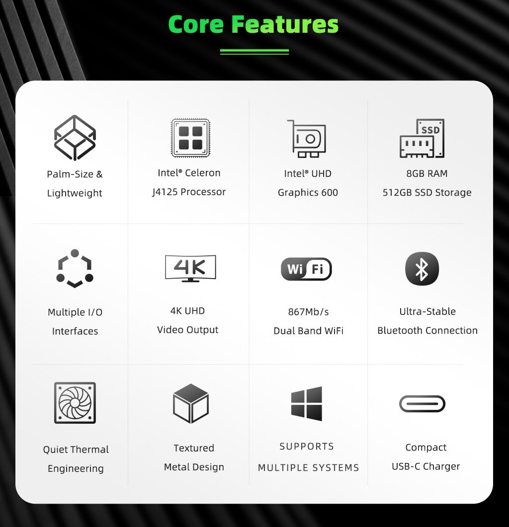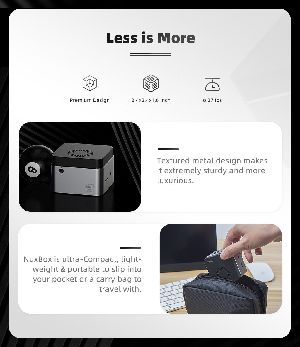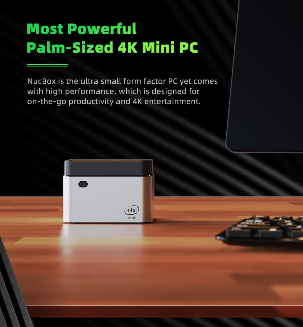 Most powerful.Palm-sized 4k Mini pc:Nucbox is the ultra small form factor pc yet comes with high performance, which is designed for on-the-go productivity and 4K entertainment.Great Performance comes in Small Package:Nucbox achieves unparalleled fluency and unbelievable quick response.Intel UHD Graphics 600:Through a series of intense testing , Nucbox can run most of mainstream lightweight games smoothly at a very high frame rate.