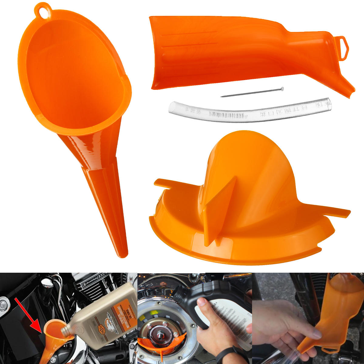 Description: Material: Plastic Color: Orange 3pcs set, convenient Reusable funnels makes it easy to add oil to your primary cavity Easy to installFitment: Transmission Crankcase Fill Funnel For Honda,Kawasiki,Yahama, ect. most of motorcycle Primary Case Oil Fill Funnel ForEvolution 1340 '99-'00 ForDyna '99-'17 ForSoftail '99-17 except FLSB ForTouring and Trike models'99-'15 except FLHTCUL, FLHTKL or '07-'15 Touring or Trike models with