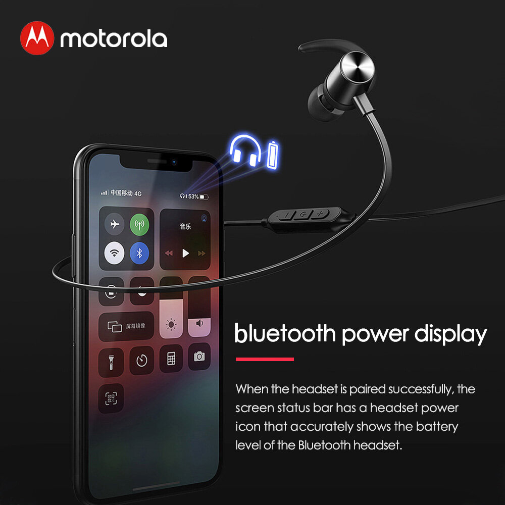 Features: 1.Simple line control operation: Simple control,switching smoothing.2.isolating noise: Fit the ear canal to isolate noise.3.Neck design: Fashion style.4.15mm speaker driver: Excellent sound power. Specifications BrandMOTOROLA ColorBlack Wearing TypeNeckband MaterialABS+PC Net Weight (g)146g MicrophoneYes Volume ControlYes bluetooth VersionV5.0 WaterproofIPX5 Supported ProfilesHSP/HFP/A2DP/AVRCP Support Audio decodingAPT, AAC Transmission Distance15m Frequency Response