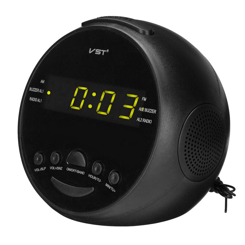. Fonctionnalite: -Amplificateur radio AM / FM (recherche automatique). -0.6 eaffichage LED. -Temps et reveil. -Dormir et fonction snooze. -Reveil e la radio / sonnerie. -AC puissance 220V / 50HZ. -Corne integree. Caracteristiques: Materiel: ABS Modele: VST909 Alimentation: DC 5V Puissance nominale: 0.5W Plage de frequence FM: (64,0 ~ 108,0) MHZ Gamme de frequences AM: 522 ~ 1620) KHZ LED affichage de l'horloge: systeme de 24 heures Volume numerique: 1 ~ 16 niveaux, volume par defaut: 9 niveaux Fonction de recherche automatique / manuelle de canaux: canaux automatique / manuel, enregistrer 10 canaux, rechercher tous les canaux, etc. Batterie de secours: AAA * 2 (non incluse) Taille: 12.5 * 11 * 9.5cm Emballage inclus: 1 x manuel utilisateur 1 x horloge 1 x adaptateur