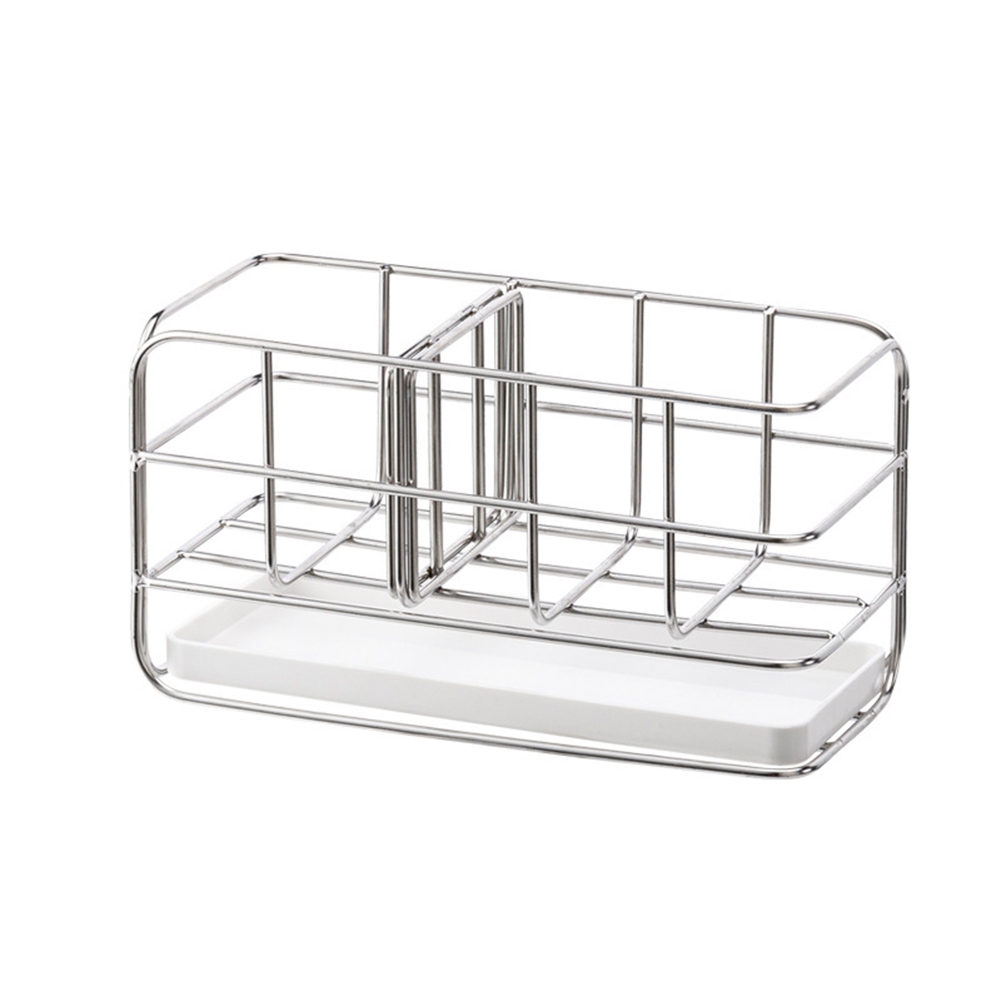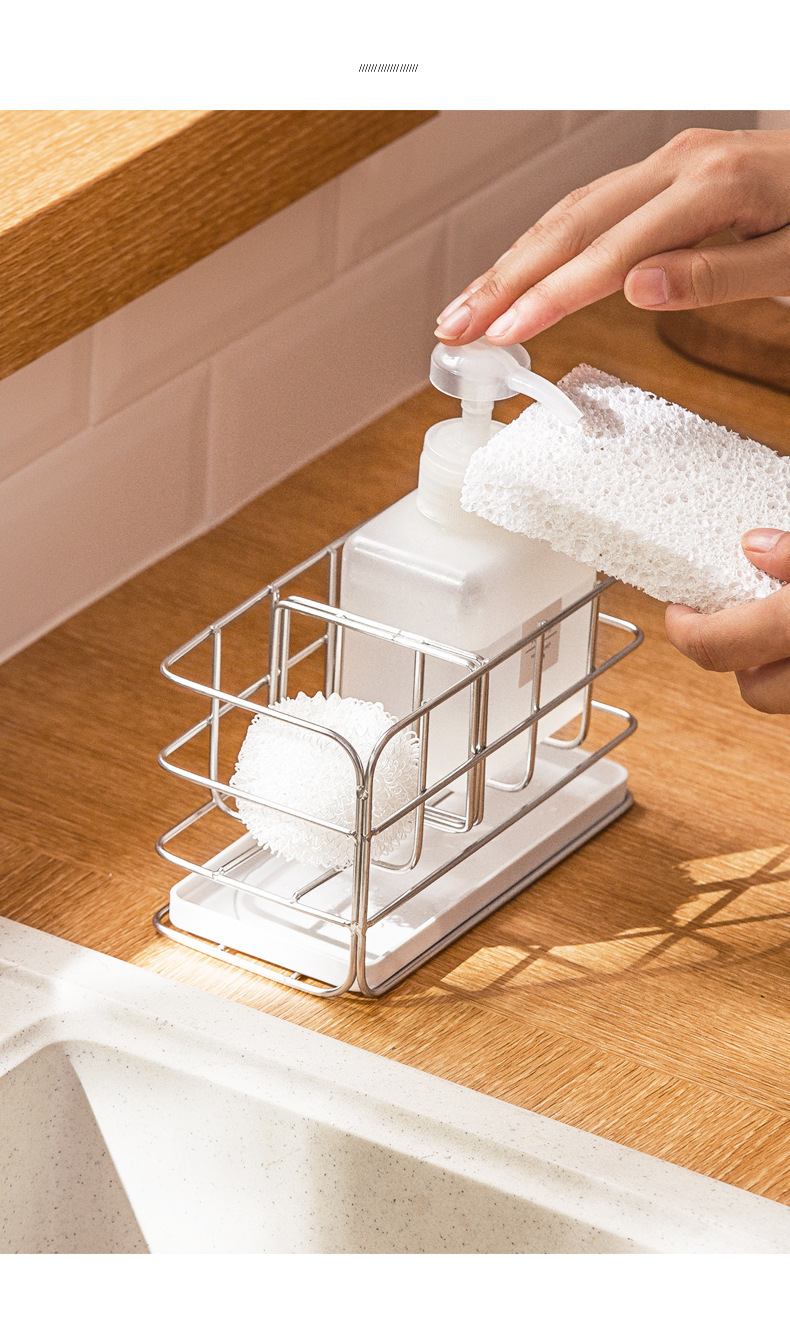 Stainless steel sponge drain rack, made of fine 304 stainless steel and PS material. The drain pan at the bottom is designed to drain and collect water. Equipped with magic stickers, wall-mounted countertops. The partitions can be moved, the size of the compartments can be adjusted freely, the kitchen small things can be stored flexibly, and the countertops are clean and refreshing.
