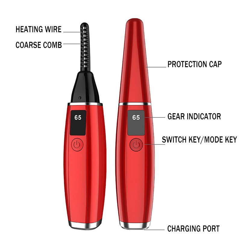 Specification:Type:Heated Eyelash Curler.Temperature:65?,85?.Size:26*26*138mm.Color:Black/White/red.power supply:USBMaterial:  Heating wire, PC, ABS, acrylicBattery mAh: 380mAhOperating voltage: 3.7VCharging time: 1hUse time: 80 minutes