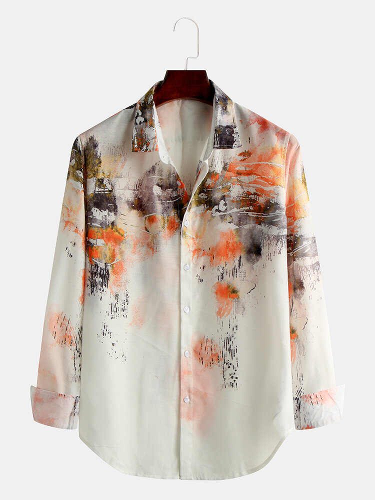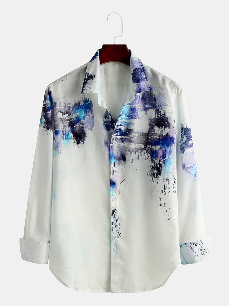 Oriental Ink Splash Landscape Print Long Sleeve Casual Shirts – Blue XL