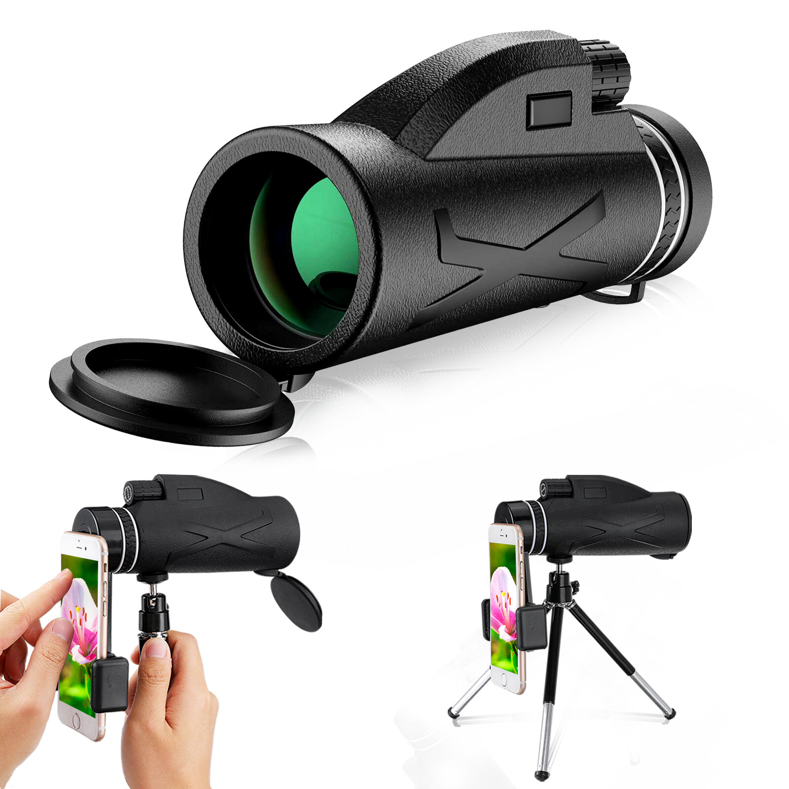 Features:?80x100 HD High Power Monocular?Telescope Mmonocular telescope provides 80x magnification with 100mm objective diameter wide lens, and a clearly and wide field of view, ideal for outdoor enthusiasts and wilderness explorers to enjoy the beauty of the distance. Perfect for hiking, hunting, climbing, bird watching, ball games, concerts, watching wildlife and scenery.?High Contrast and Resolution Images? Latest optics technology, the zoom telescope is equipped prism and fully multi-coated lens,waterproof and dustproof, guaranteeing superior light transmission and brightness. The light transmission reaches up to 99.5% visibility, delivering brighter and high contrast images for you.?Universal Compatibility & Easy Installation?Monocular telescope comes with the latest quick alignment smartphone holder and tripod.simple to install in minutes, and will provide HD images or videos to share your beautiful and amazing moments with your family and friends.Perfect for most phones.