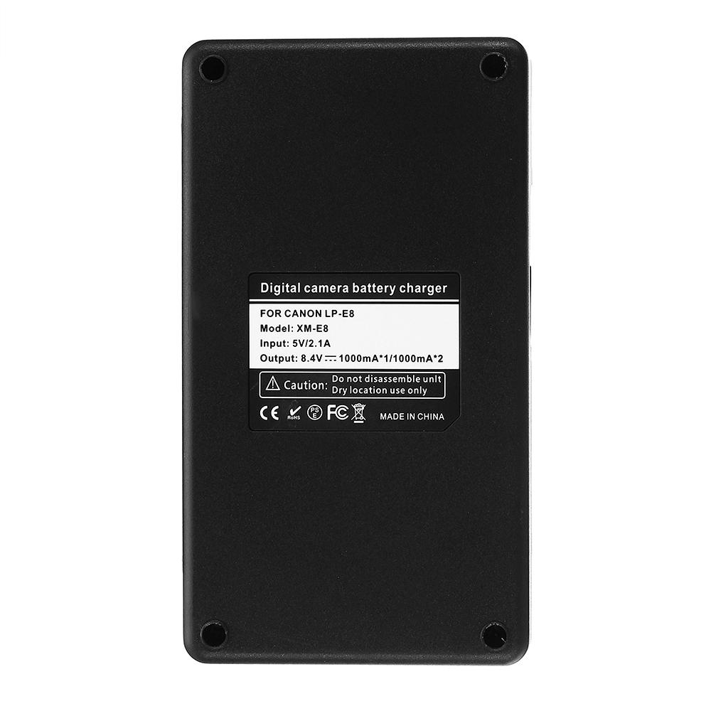 . Caracteristiques: Petit et leger, facile e transporter, vous pouvez charger la batterie pour appareil photo Canon e tout moment Prise de charge USB, vous pouvez l'utiliser dans le monde entier sans vous soucier de la mauvaise prise Livre avec un indicateur LED indiquant l'etat de charge de la batterie Il y a aussi un port USB de sortie d'alimentation pour charger les appareils comme les telephones portables, quand les batteries de votre appareil photo sont pleines d'energie mais que votre telephone est e court d'energie, vous pouvez charger votre telephone avec une batterie d'alimentation Entree: 5V 2.1A Sortie: 8.4v 1000ma x 1, 8.4V 2000ma x 2 Emballage inclus: 1 x Palo LP-E8-C Batterie Chargeur 1 x Manuel de l'utilisateur (chargeur uniquement, piles et telephone non inclus)