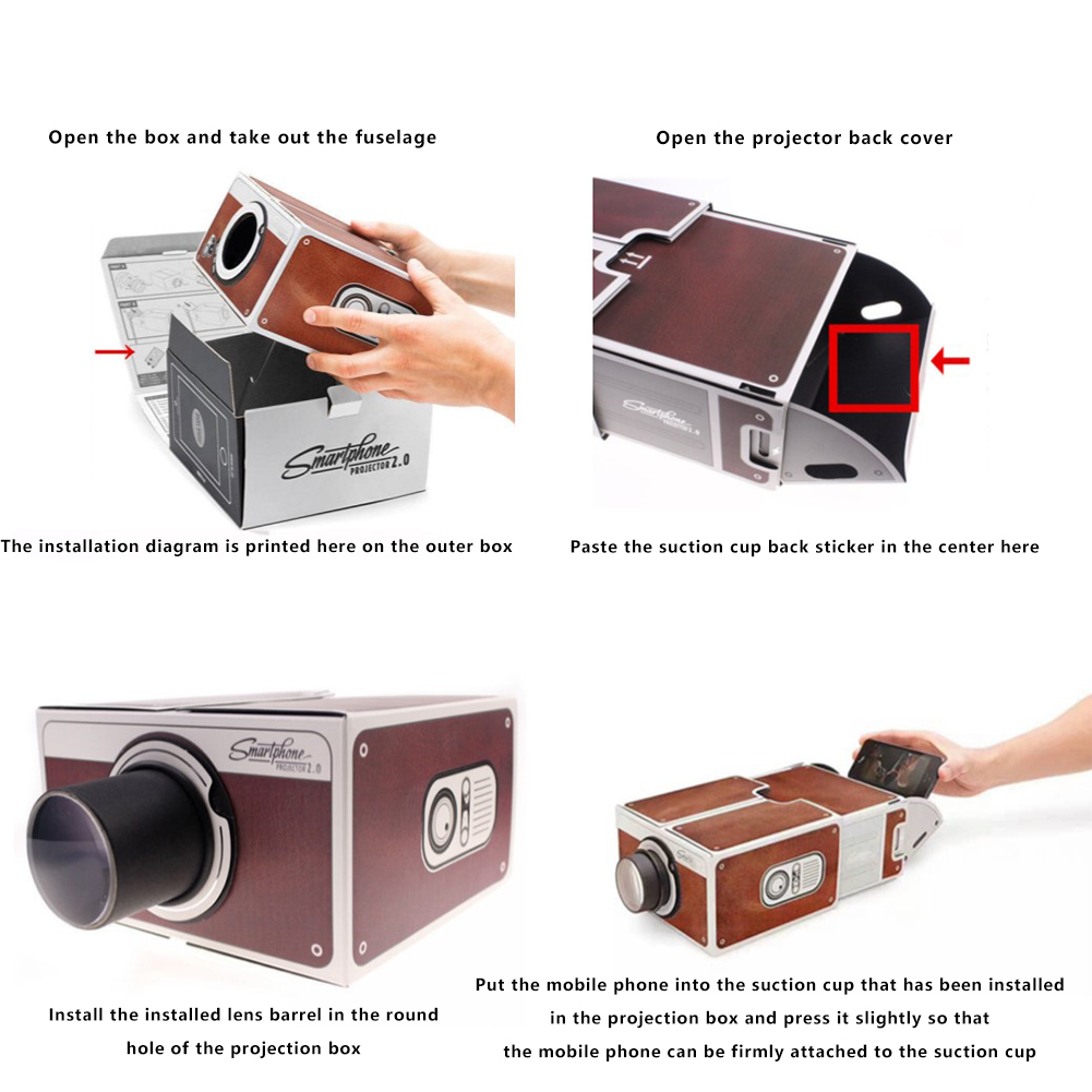 The DIY smartphone projector is easy to operate, just attach the projection lens to use. SmartPhone Projector is a homemade miniature projector for mobile phones. You can project the video/movie played on your mobile phone to the wall, just like a small home theater. SmartPhone Projector 2.0 products include installation-free projection boxes, magnifying lenses and some other accessories, which can be easily assembled. The size of the phone that can be inserted: no more than 14.5x8 cm.