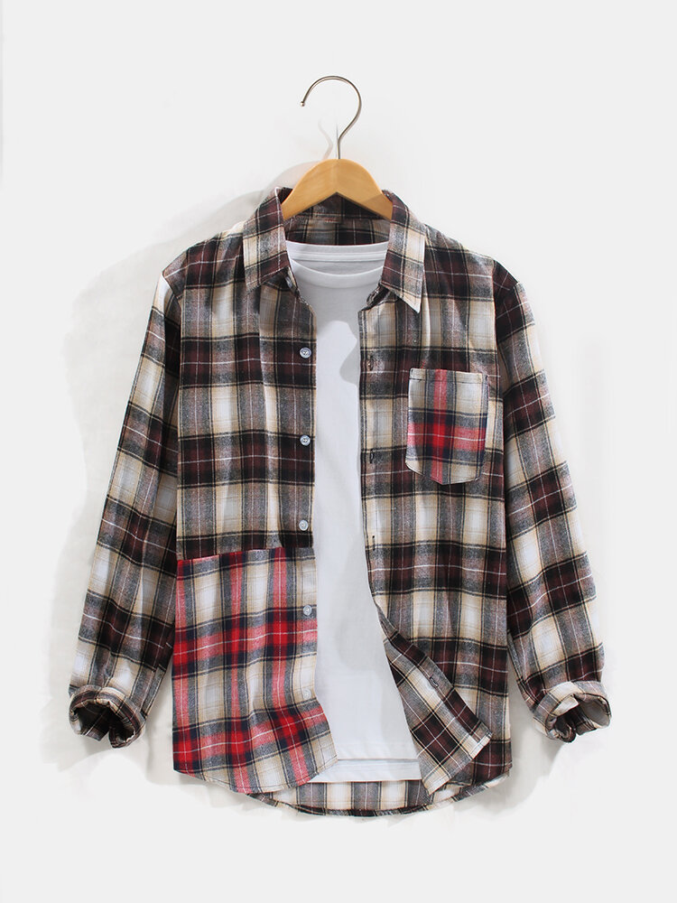 Patchwork Plaid Chest Pocket Button Up Long Sleeve Casual Shirts For Men – Brown S