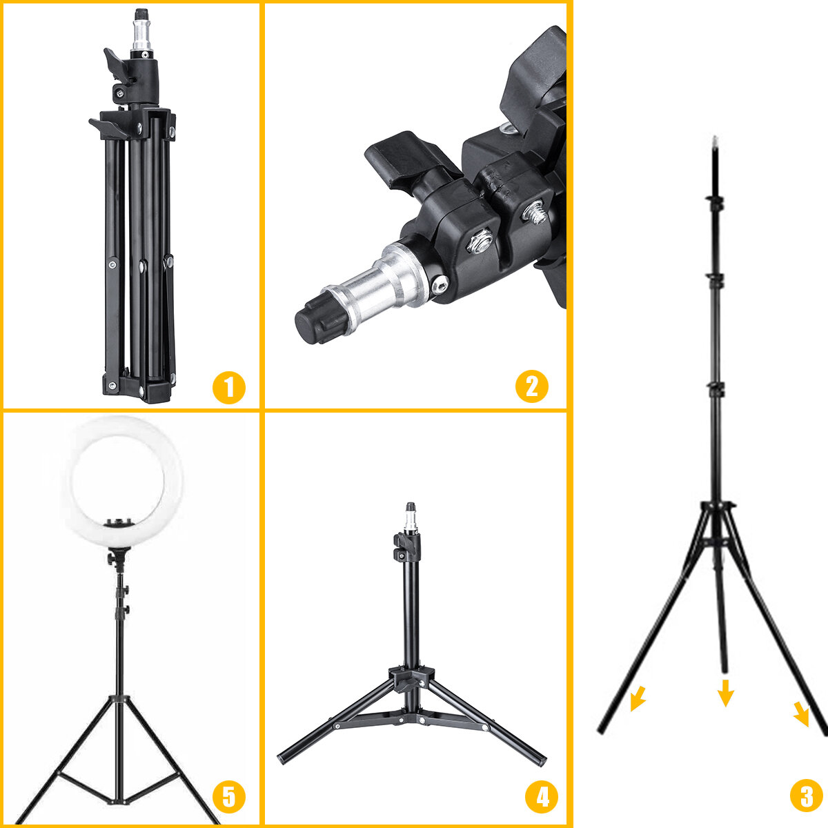 - Pratique pour transporter le support de lampe reversible, s'etendre jusqu'e 2 metres, retrecir de 55 cm, facile e realiser avec lumiere annulaire et flash.