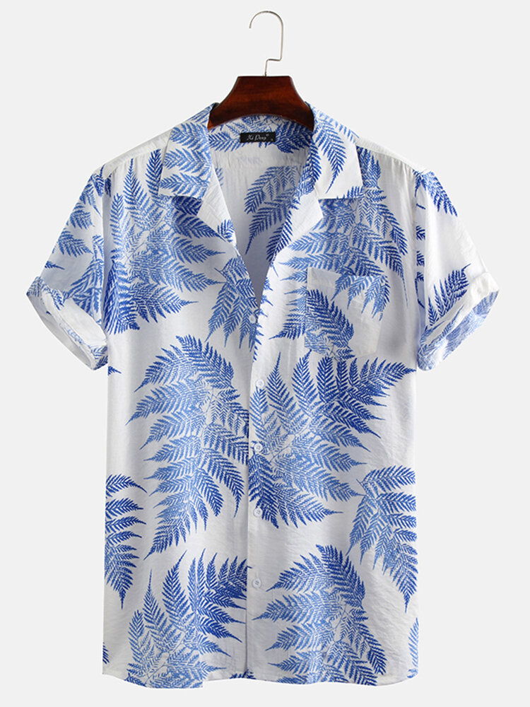 Pine Leaves Print 100% Cotton Short Sleeve Chest Pocket Relaxed Shirts – Blue S