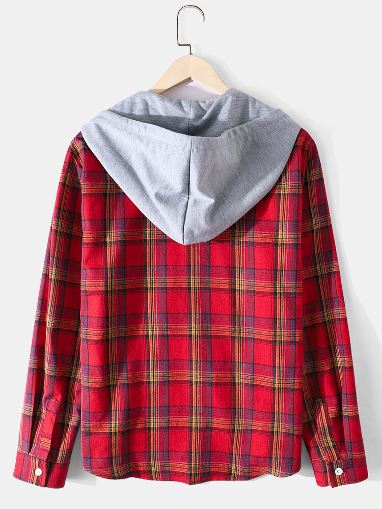 Plaid Print Patchwotk Hooded Curved Hem Long Sleeve Shirts For Men – Red 2XL