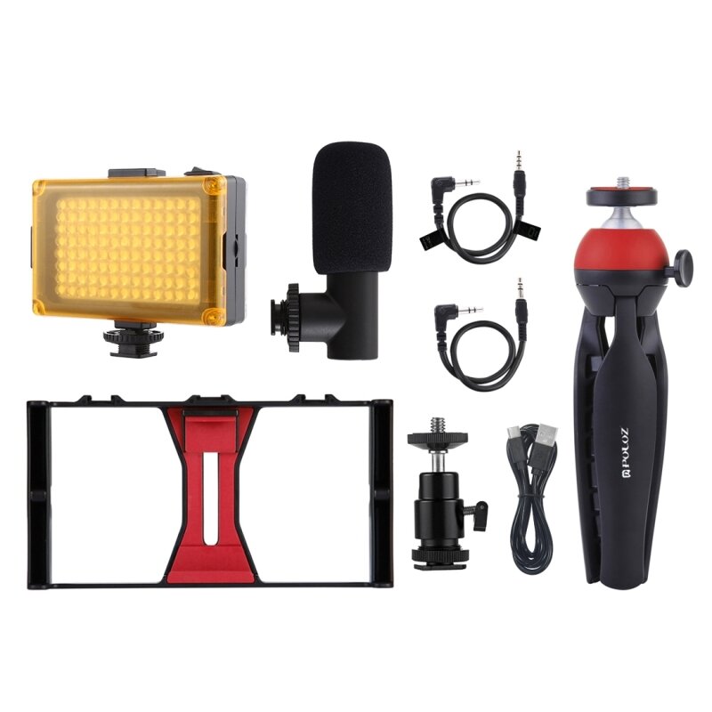 PULUZ PKT3023R 5 en 1 Vlogging Kits de plate-forme video Smartphone de diffusion en direct avec LED trepied de tete de montage de trepied de Microphone de lumiere video – Rouge