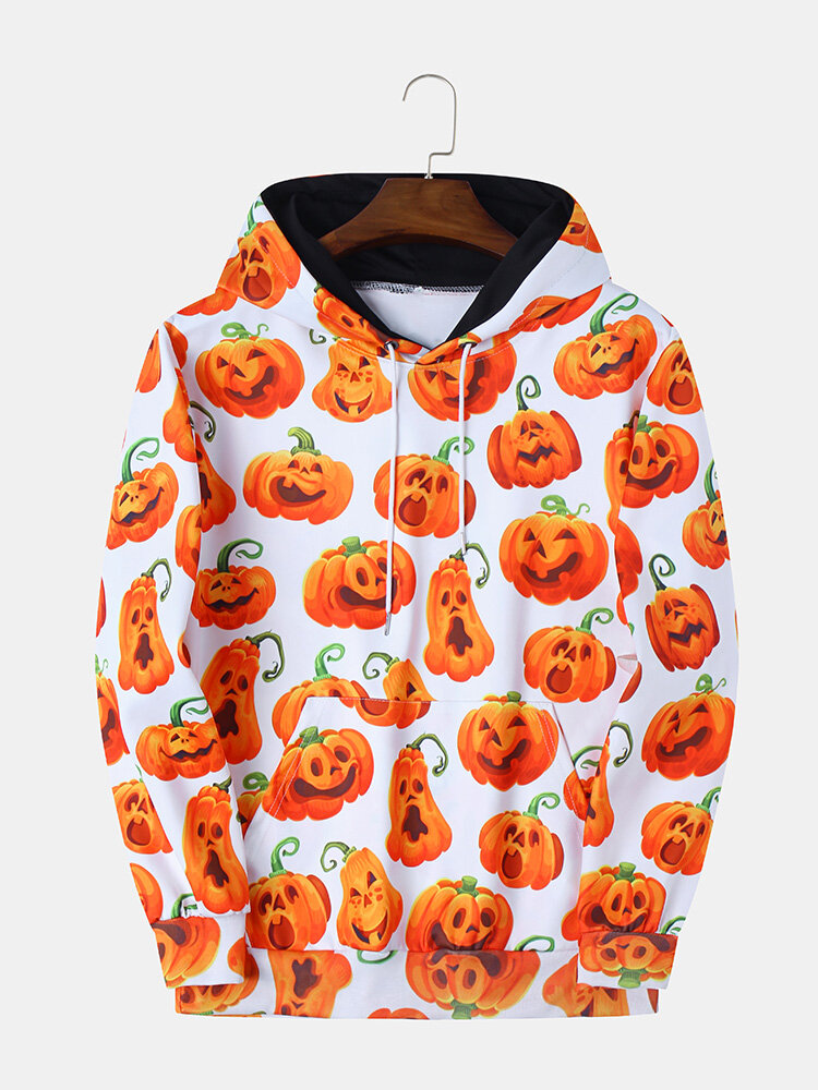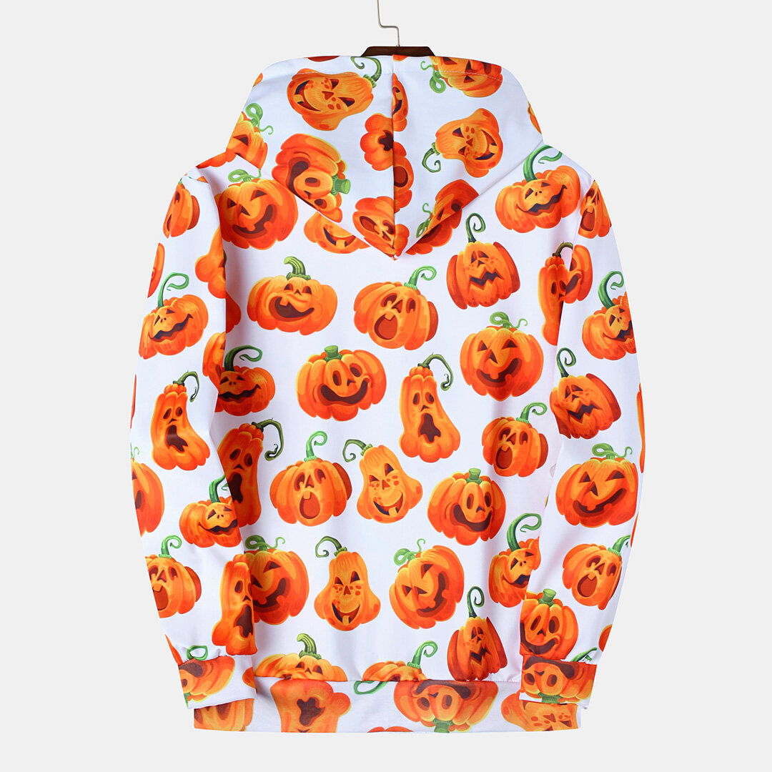 Pumpkin Monster Print Casual Insert Pocket Hooded Sweatshirt – M White