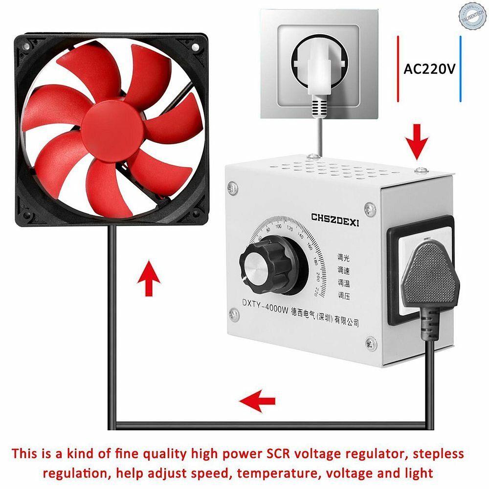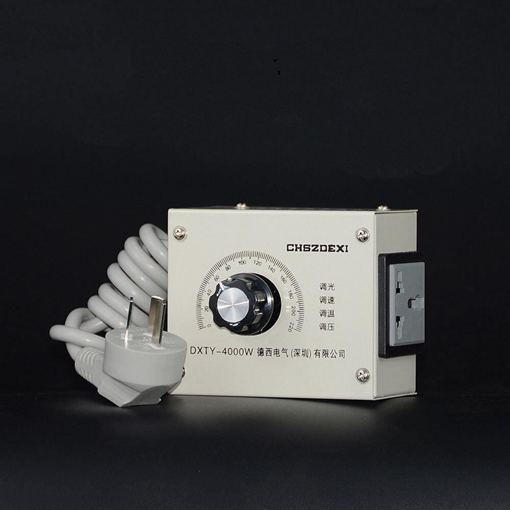. Caracteristiques: Modele: DXTY-4000W Tension d'entree: 220V AC Tension de sortie: 0-220V AC reglable (le voltmetre ne fonctionne pas lorsque la tension de sortie est inferieure e 5V) Vitesse d'entree: 10-220 (tr / min) Plage de reglage de la vitesse: 220 (tr / min) Plage de vitesse de sortie: promesse Puissance nominale: 4kW Courant nominal: 9A Courant limite: 18A Mode d'affichage: type de pointeur Puissance moteur adaptee: 2000 (kw) Taille: 10 * 11,5 * 8,4 cm Emballage inclus: 1 x regulateur de vitesse DXTY-4000W avec interrupteur
