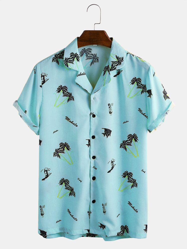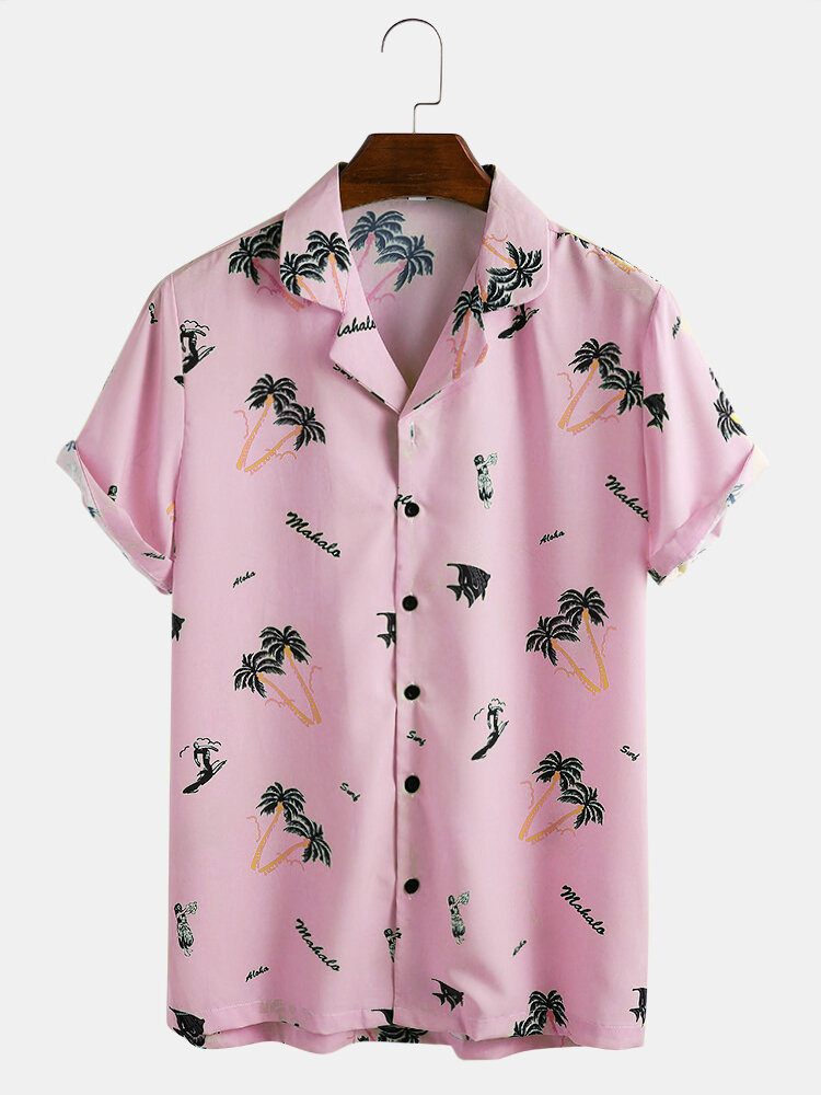 Satin Cartoon Coconut Tree Printing Short Sleeve Casual Revere Shirts – Pink XL