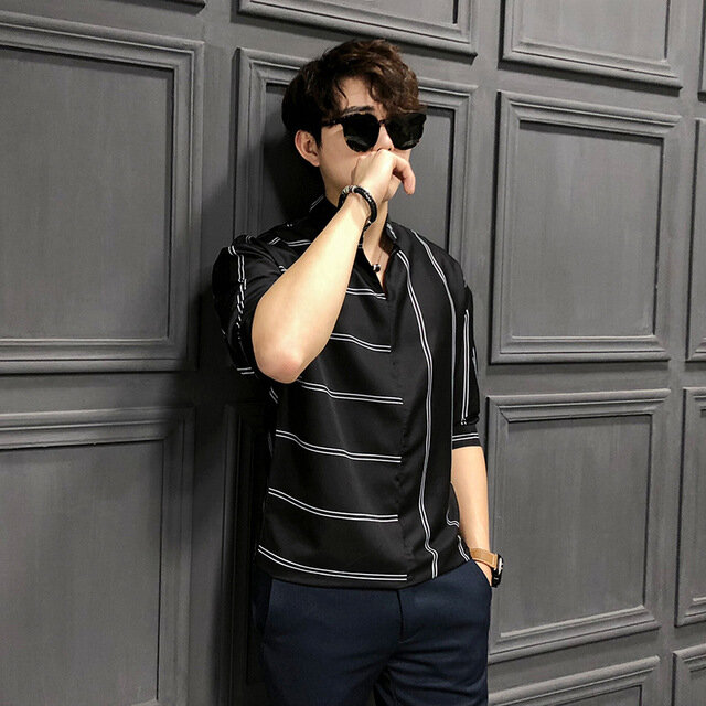 Season New Men’s Men’s Loose Five-point Sleeves Striped Shirt Youth England Wild Sleeves Shirt Tide – S Black