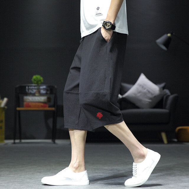 Seasonal Linen 7 Pants Male Tide Plus Fertilizer XL Fat Loose Wide Leg Pants Men’s Chinese Style Men’s Shorts – 2XL Lake Blue