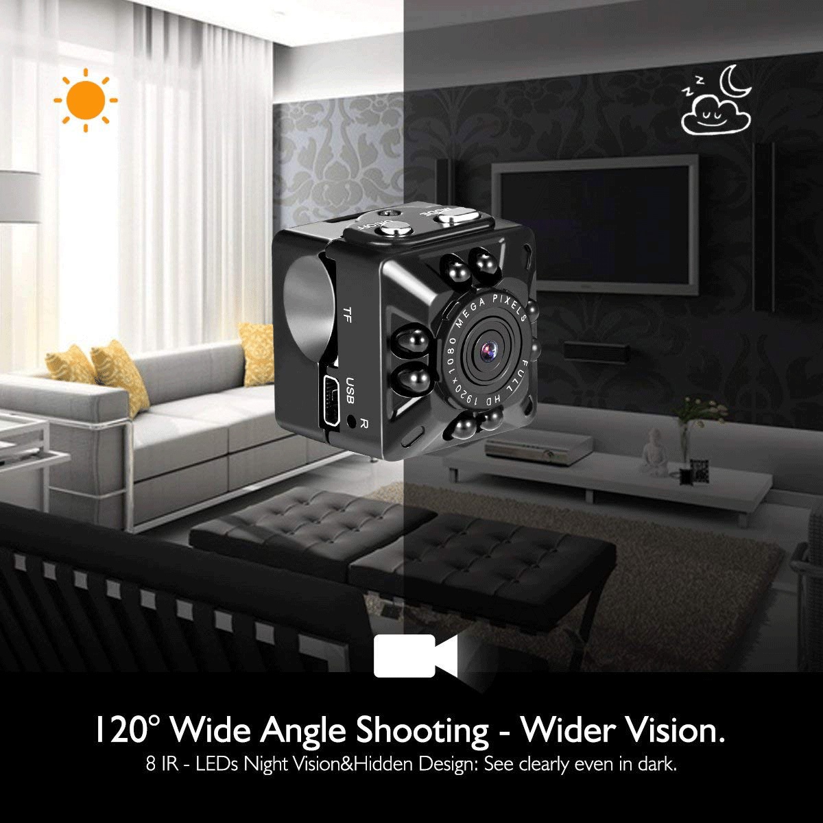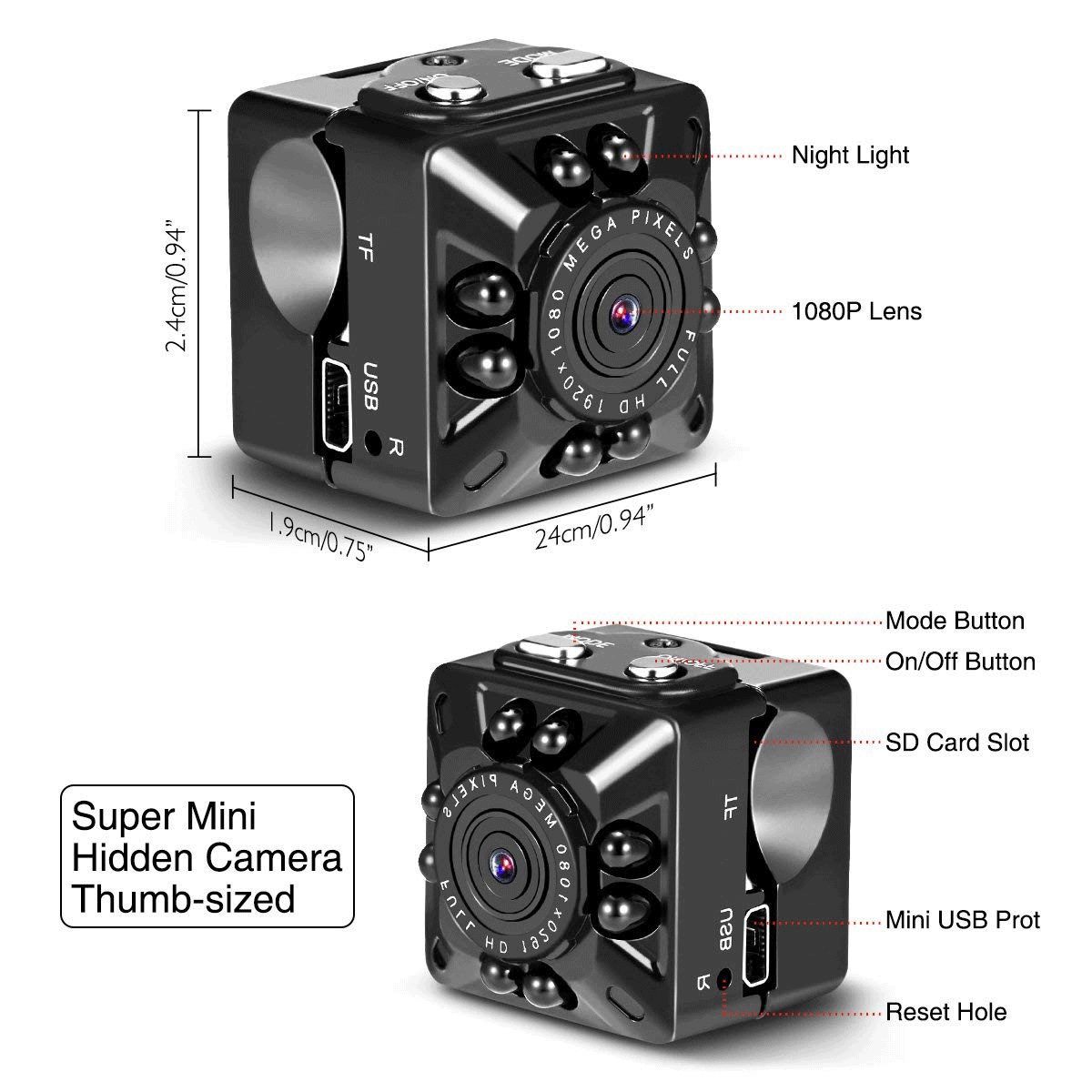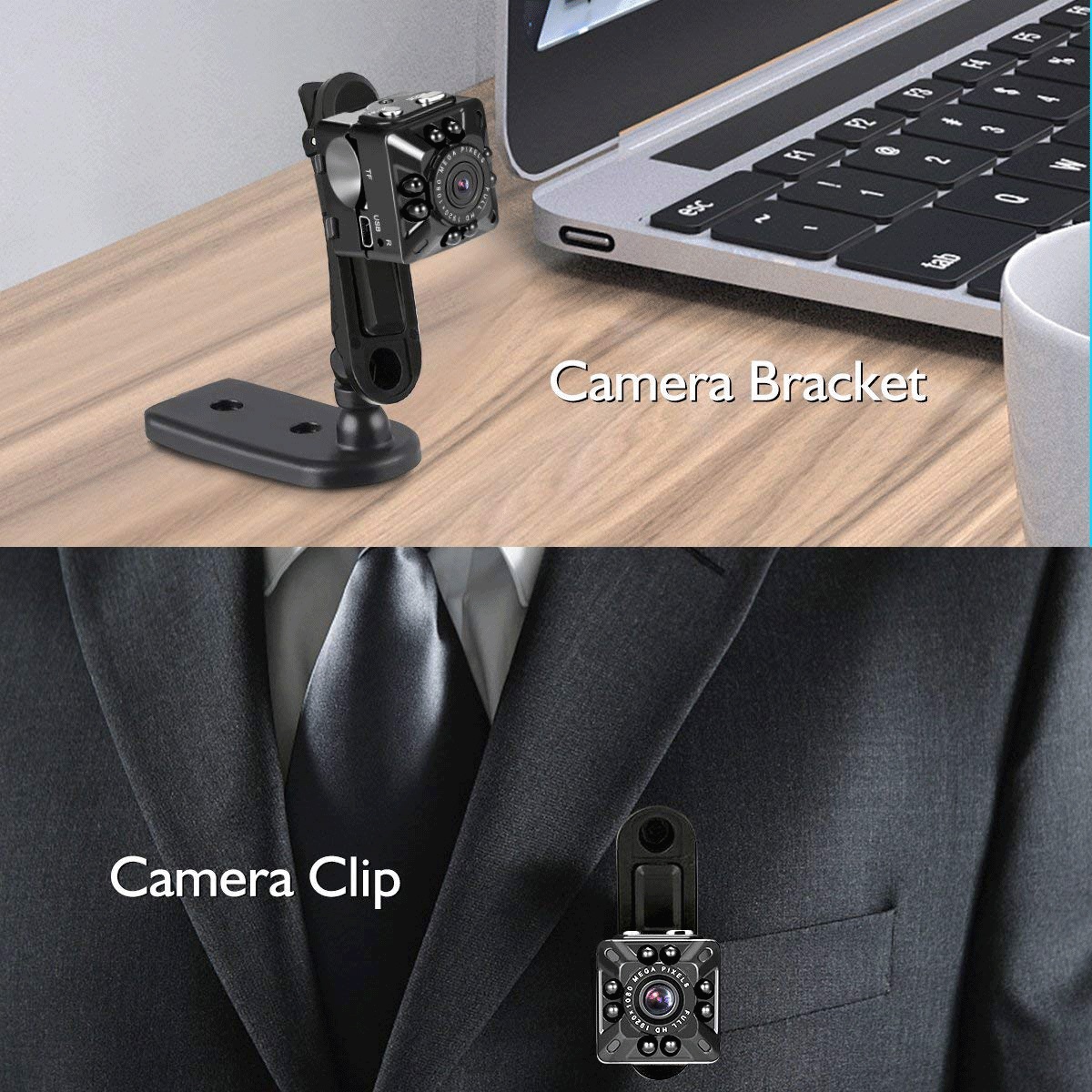 Mini camera provides 1080P HD DV DC superior images and videos with a range of 5.0-6.5ft. With intelligent motion activation, the camera will start the recording to record the critical moments when motion is identified. It has automatic cyclic storage covering function to save the storage space of the memory card. Can be see clearly in dark. 8pcs infrared lights are equipped in the video camera to realize the clear image shooting with minimum illumination.