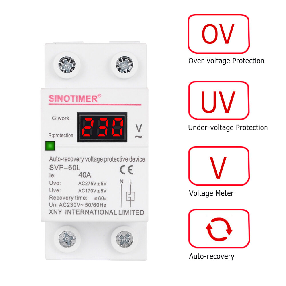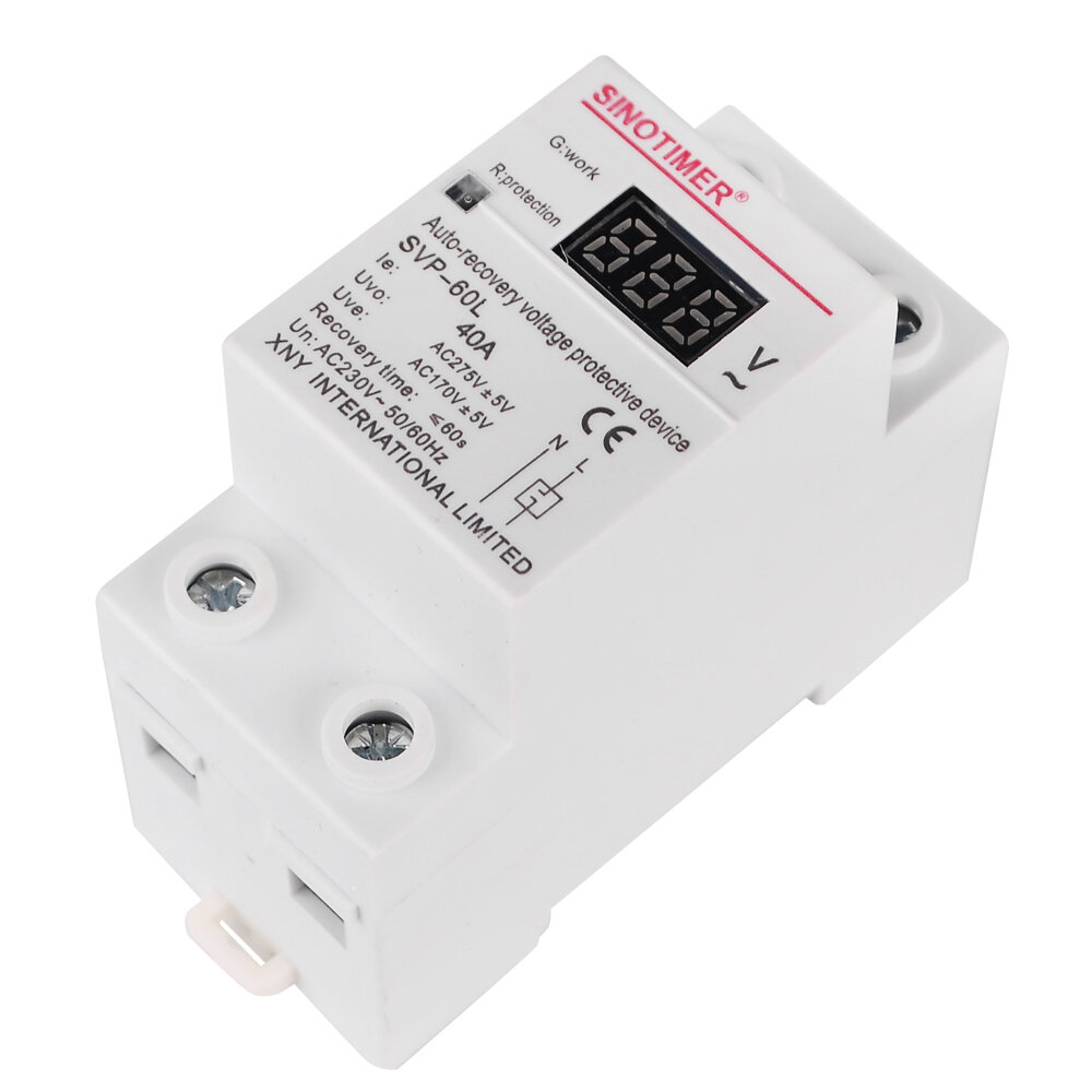 SINOTIMER SVP-60L 230V AC 40A Digital Din Rail Automatic Recovery Over Under Voltage Protection with Voltmeter Display