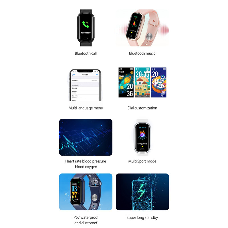 --Always pay attention to your health: heart rate / blood pressure / oxygen monitoring, sedentary reminder,sleep tracker.--A good helper for exercise: step counting, distance, calorie consumption, exercise mode.--IP67 waterproof, whether it's going to the pool for a few laps or flying by the sea, you can enjoy the moment with your hands and feet.--Real time synchronous push, receive all kinds of me ages, synchronize with mobile phone.--Size: Screen is 0.96 inches, Battery capacity is 180mAh.