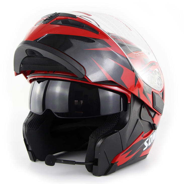 : Design of double lens, high-definition transparent anti-fog and endoscopic anti-fog ultraviolet, the lens can be opened when pulled down sunglasses, push-on shrinkable endoscopes Hidden noise reducing mice. traditional mobile phone middleheads can be used when riding. Very noisy, to solve this problem electronic noise reduction technology is used in the midwifery. The Headset are hidden inside the helmet, high sensitivity full copper pointing is used . Microphone, make sure the call is clear. Surface lift switch, red button at chin, press up open and turn into a half helmet. Multistage safety buckle, adjustable helmets are tight to wear. Specification: : SOMAN Model NO.: 955 Material: ABS Color: As the pictures show Size head circumference : S 55-56CM , M 57-58CM ,L 59-60cm , XL 61-62cm , XXL 63-64cm Package Included: 1 X Motorcycle blutooth Helmet