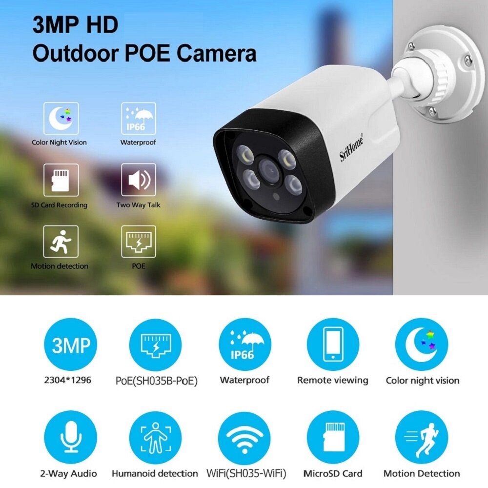 Srihome SH035 SH035B 3MP PoE camera IP WiFi sans fil Vision nocturne exterieure intelligente camera de securite e domicile CCTV Surveillance video – Wifi
