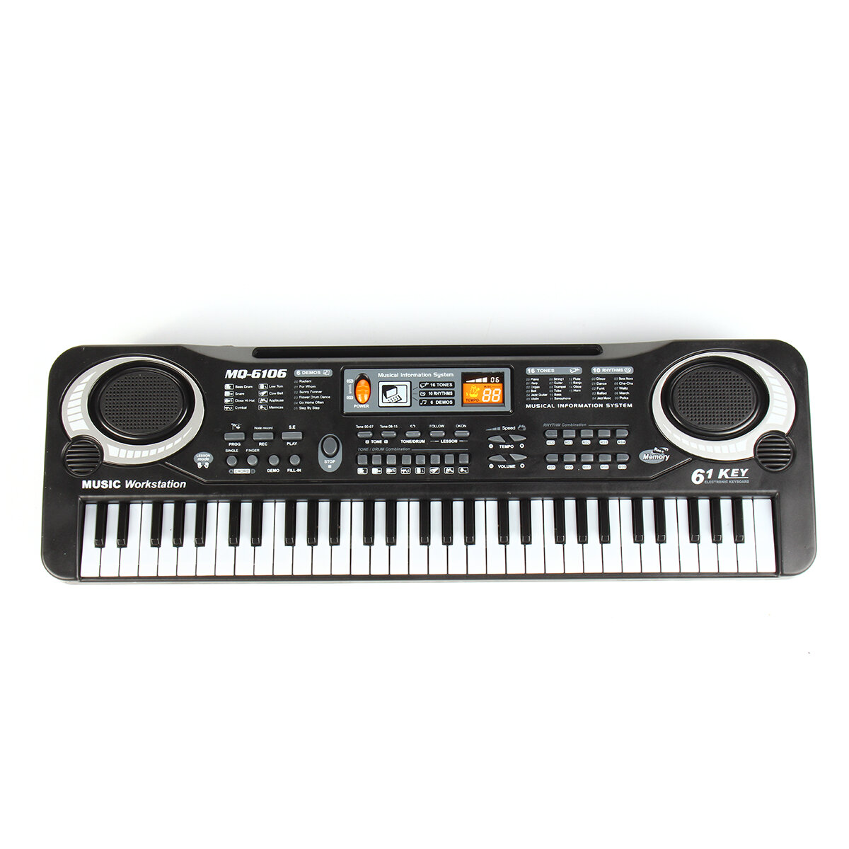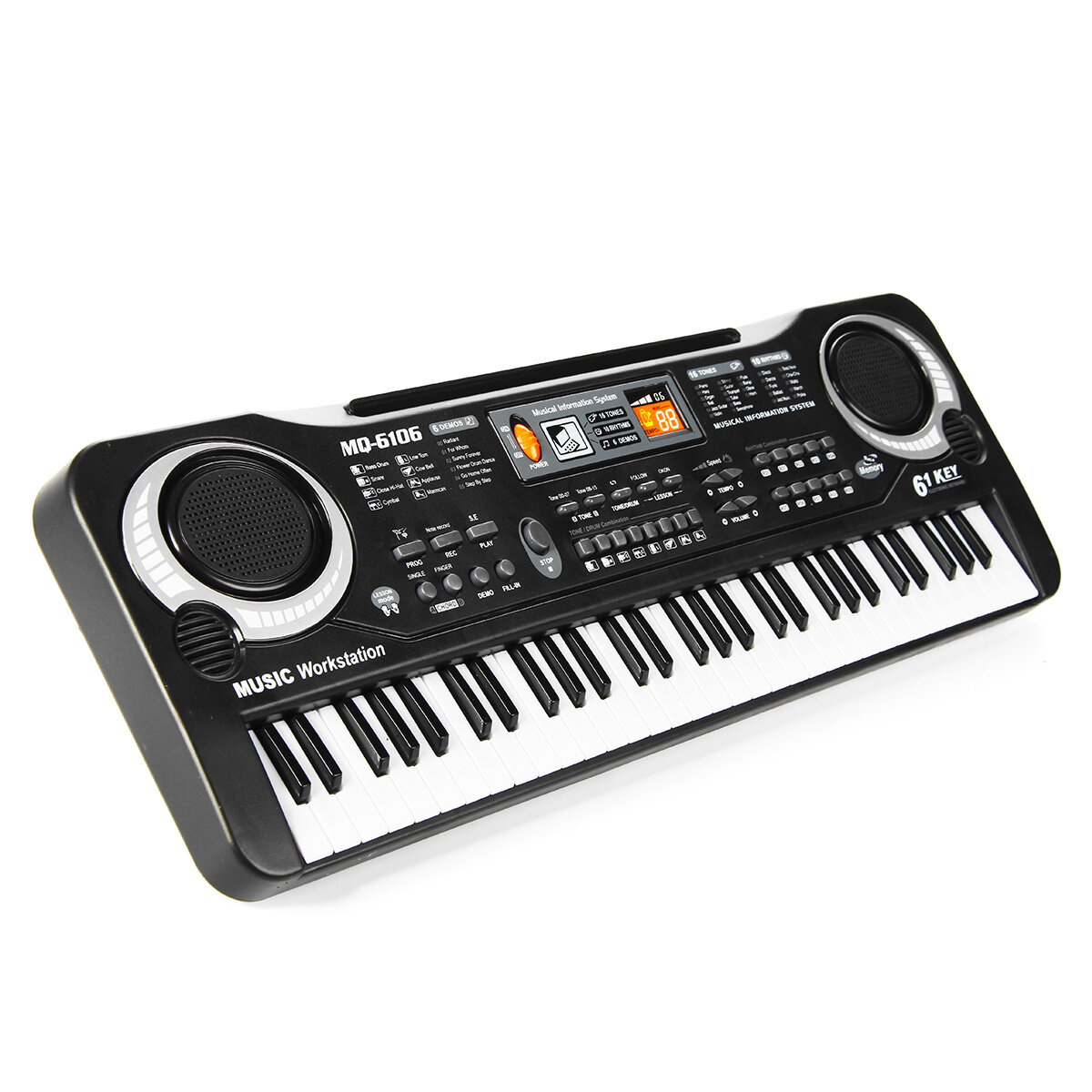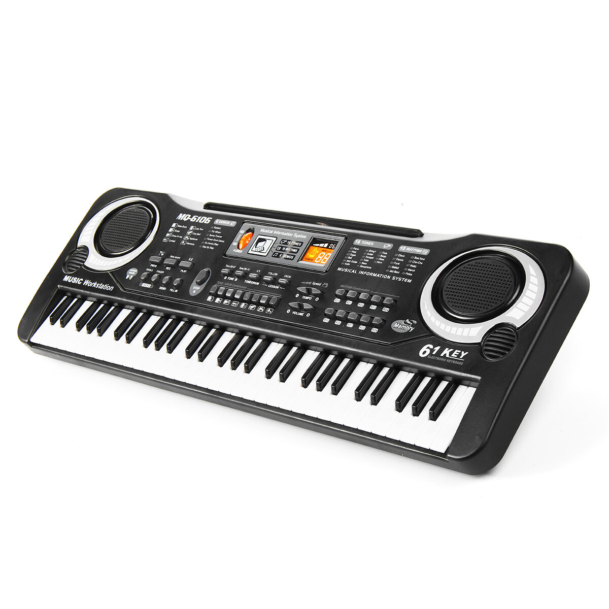 . Caracteristiques: 61 touches d'accordeon standard avec une Microphone. Prend en charge le chant, le suivi, l'enseignement. 16 sons, 10 types de rythmes, 8 types de percussions et 6 morceaux de demonstration. Port haut-parleur / microphone / telephone portable externe. Caracteristiques: Materiel: ABS La couleur noire Adaptateur: DC 9V (inclus) Batterie: 4 x AA Batteries (non incluses) ege: 1 ~ 8 ans Dimension: 540 x 170 x 53 mm Emballage inclus: 1 x 61 touches clavier de piano electronique pour enfants 1 x ceble USB 1 x microphone 1 x manuel d'utilisation