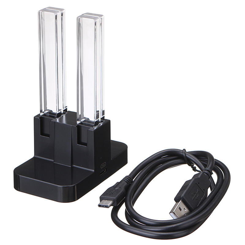 . Caracteristiques: Materiau: Acrylique + ABS (Acrylonitrile Butadiene Styrene) Taille: env. 8,5 x 5 x 11,7 cm / 3,35 x 1,97 x 4,61 pouces Tension d'entree: Type-C 5V Courant de charge: 200mA x 4 Compatible avec: Pour Nintendo Switch Joy-Con Alimentation universelle USB 5V Les 4 colonnes transparentes emettent du vert emeraude, ce qui indique que le siege de chargement est electrifie. Accrochez le joy-con au support de charge, le voyant de la colonne devient rouge, indiquant que la charge est en cours. La colonne carree redevient verte signifie que l'electricite est pleine Peut charger 4 contreleurs en meme temps, chaque contreleur a son propre voyant indicateur de colonne Emballage inclus: 1 x station de chargement 1 x ceble de charge