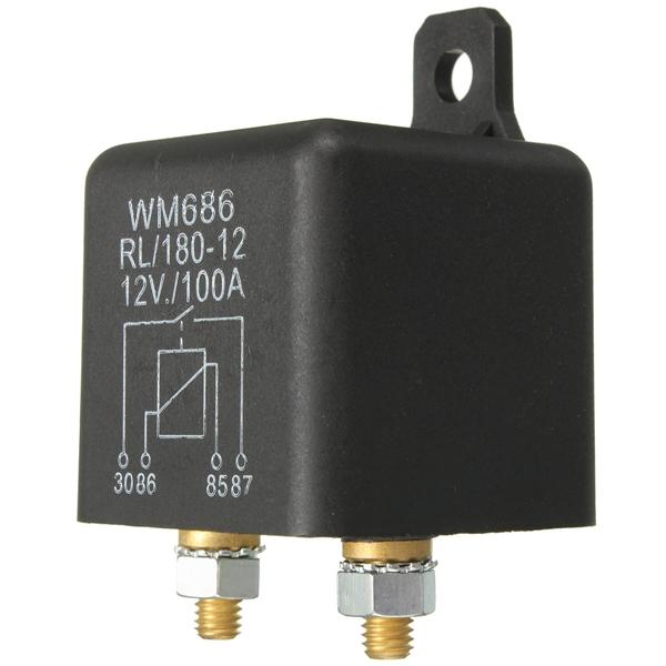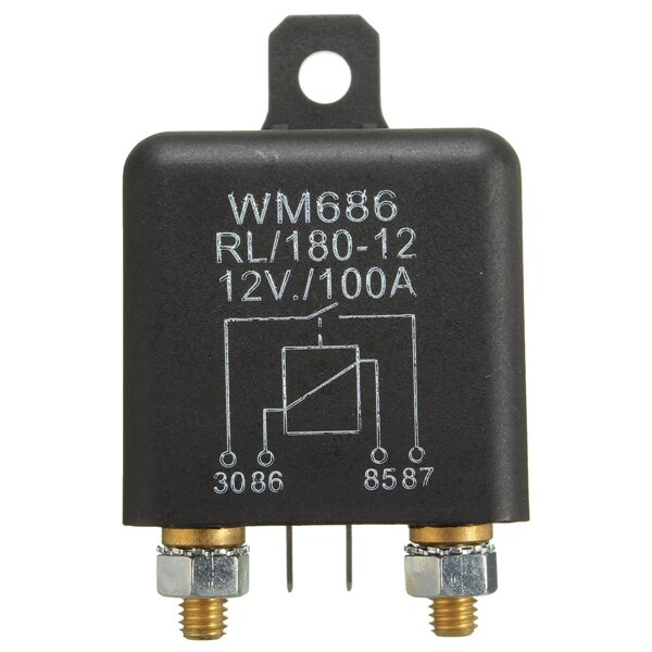 Switch Split Charge Relay 12V 100Amp 4 Pin Heavy Duty ON OFF for Car Van Boat Features: 100 percent and high quality. Durable and Firm and Stable. Heavy duty make or break on,off relay. Universal fit for Ideal for all 12V applications, such as car, van, boat, etc.. Specification: Color: Black Voltage: 12V DC Rated Current mA : 100A No. of Pins: 4 pin Terminals: 2 x 6mm eye terminals for the studs. 2 x 6.3mm Spades Package Included: 1 X 12V 100A Relay
