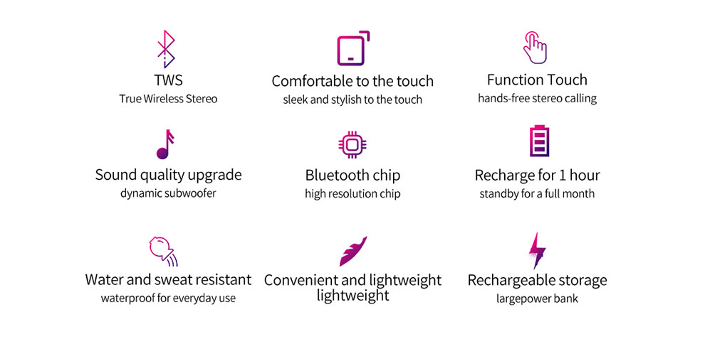 The half-in-ear: Design is ergonomic, comfortable and secure, the rounded arc can disperse the pressure on the ears.Birth as the focusmultiple leapfrog experiences: Every time it is launched , every step is loud and sound.Material: The whole shell is made ofimported ABS material, supplemented by UV high-gloss technology.