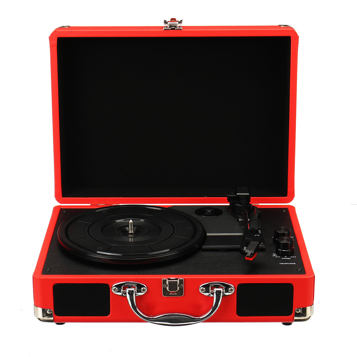 Constructed Of wood and bound in a leatherette material, the briefcase-styled record player is portable.