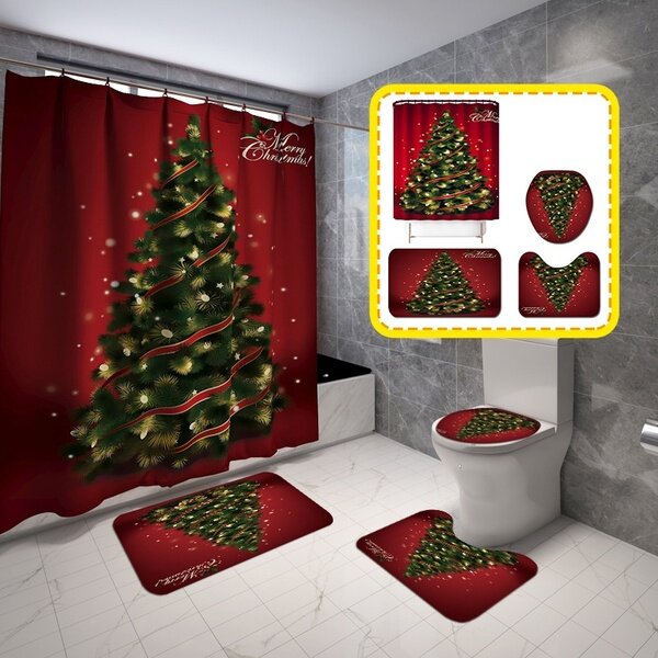 Tree Waterproof Shower Curtain Set Anti-slip Bath Mat Toilet Seat Cover Floor Mat Set – 4Pcs Set