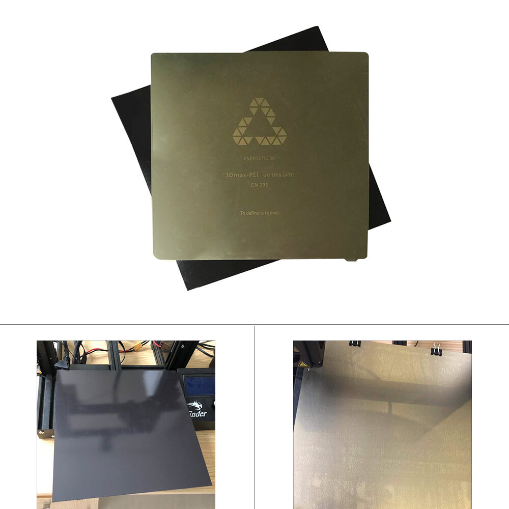 . * Veuillez choisir la taille que vous vouliez: 220 * 220mm / 235 * 235mm / 310 * 310mm Advtanges: ? 220 * 220mm / 235 * 235mm / 310 * 310mm trois tailles pour choisir ? Facile e obtenir la premiere couche meme pour un nouvel utilisateur ? Flexible, amovible, colle tres bien aux aimants ? La base magnetique peut supporter la temperature elevee e 140 e C sans perdre de magnetisme, convient e presque tous les filaments. PLA, ABS, etc. ? Nettoyage gratuit - il suffit de plier un peu la plaque, puis de retirer les impressions apres refroidissement ? Performances rapides du chauffage, moins de temps d'attente apres l'impression. ? Pour la plupart des foyers d'imprimante 3D Presentations de materiel: ? 100% veritable couleur ambre Ultem1000 (PEI), surface mate.-0,125 mm d'epaisseur ? Cette tele d'acier e ressort est plate, flexible, elle adhere tres bien aux aimants. 0,5 mm ou 0,4 mm d'epaisseur ? PEI est un ruban de 3m 468MP pre-applique, bulles libres. Comment utiliser? ? Apres avoir applique la feuille PEI sur notre feuille speciale en acier inoxydable e ressort, vous pouvez simplement utiliser 4 clips ou aimants pour la maintenir sur le lit chauffant, puis profiter de l'impression. ? Supprimez facilement les impressions 3D sur l'imprimante en retirant la plaque en acier e ressort, en la pliant et en faisant sauter l'impression. C'est simple et rend le processus de suppression d'impression beaucoup plus facile. Emballage inclus: 1 x surface de construction PEI 1 x plaque d'acier e ressort 1 x autocollant de lit chauffant e base magnetique