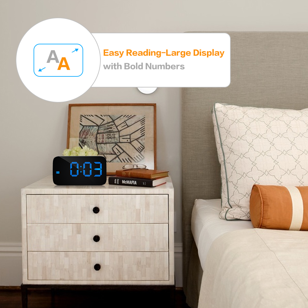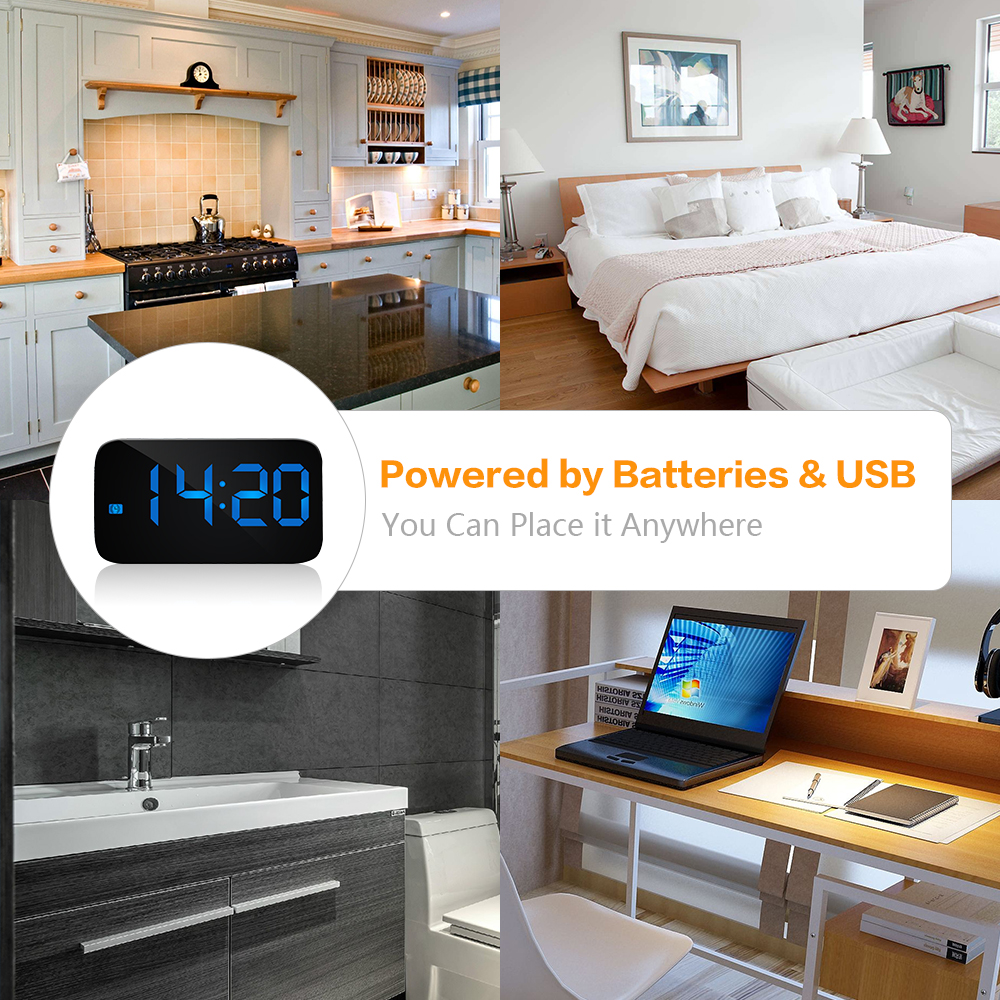 Clock will ring again after 5 minutes by pressing SNOOZE button to stop the alarm. It works repeatedly in 2 hours, make sure you will not miss anything important. There are 3 levels brightness (bright/ medium/ dim) switchable, suit for different situations. Voice activate under power saving mode when using batteries for power supply. 2 power supply methods for more convenient use, USB plug in or used 4 AAA battery powered. (not included)