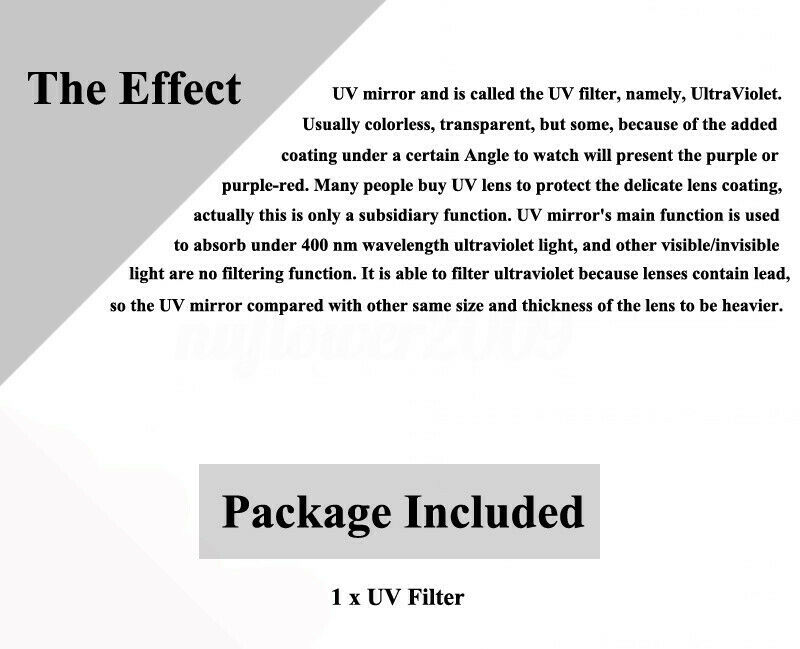Usually colorless, transparent, but some, because the added coating under a certain angle to watch will present the purple or purple-red. UV mirror's main function is used to absorb under 400 nm wavelength ultraviolet light.It's able to filter ultraviolet because lenes contain lead, so the UV mirror compared with other same size and thickness of the lens to be heavier. Prevents loss of sharpness and contrast by filtering out UV rays and Haze; Protects lens from scratches, scuffs and smudges.