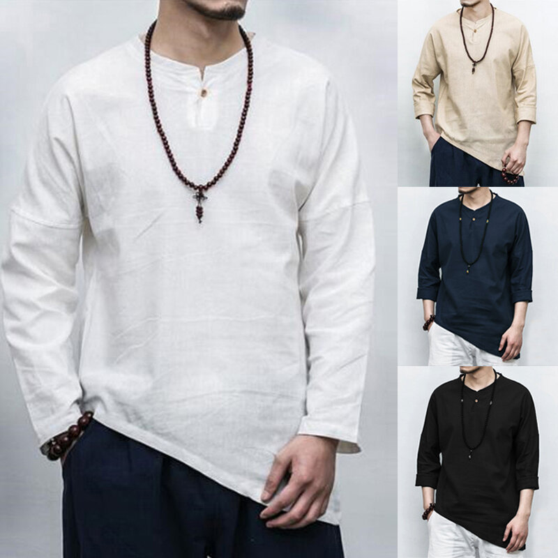 Vintage Mens Cotton Baggy Causal T Shirt Long Sleeve Chinese Kung Fu Tops Tee US – 3XL Khaki