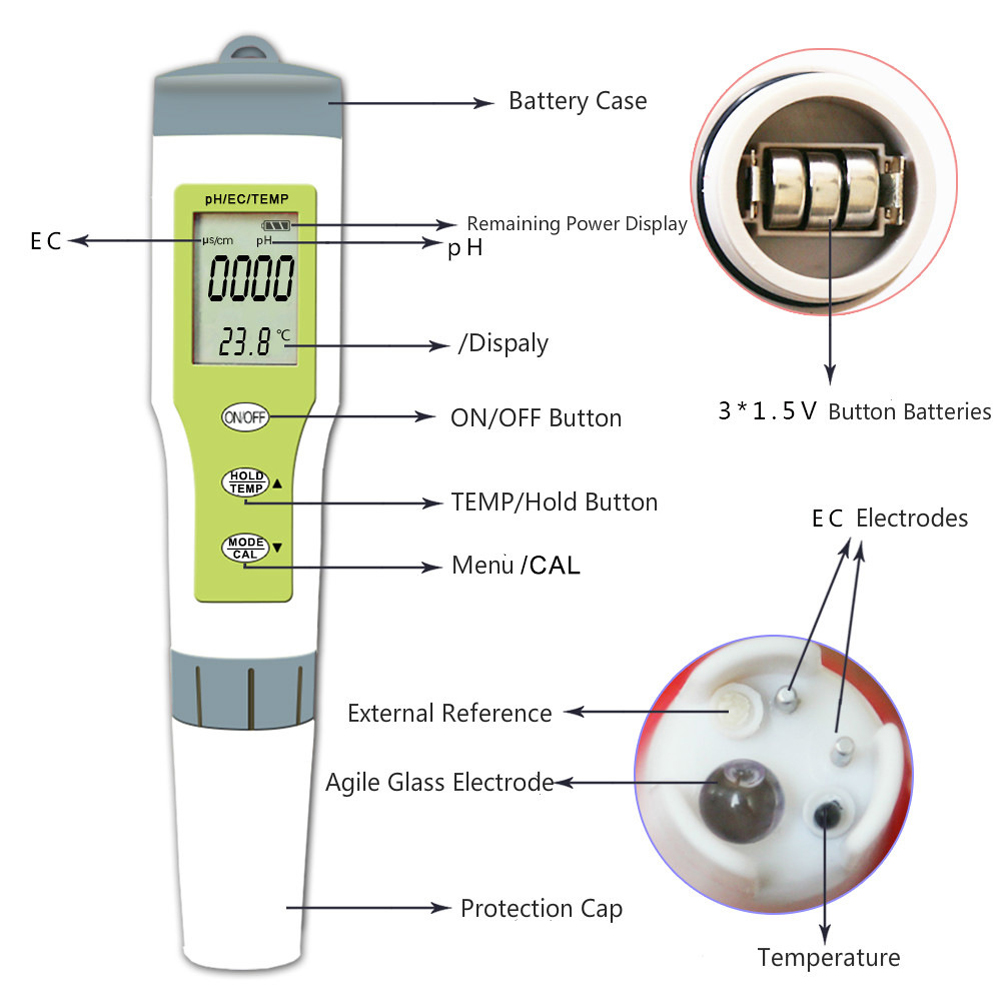 Measuring range: pH:0.00-14.00ph; TDS:0-19999ppm; EC:0-19999μs/cm Resolution: 0.01 ph; 1ppm; 1μs/cm; 0.1°C; 0.1°F Accuracy: ph: +/-0.01 ph; TDS/EC: +/-2%; Temperature: 0.5°C Battery: 3 x 1.5V LR44 button battery (not included) Temperature: 0.1-60.0°C; 32.0-140.0°F Calibration: ph: 3-point automatic calibration (6.86 and 4.00 and 9.18ph); TDS: 1413μs/cm; EC: 1413μs/cm