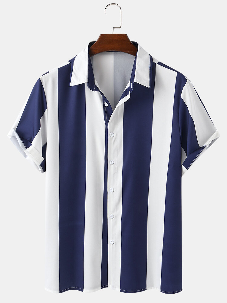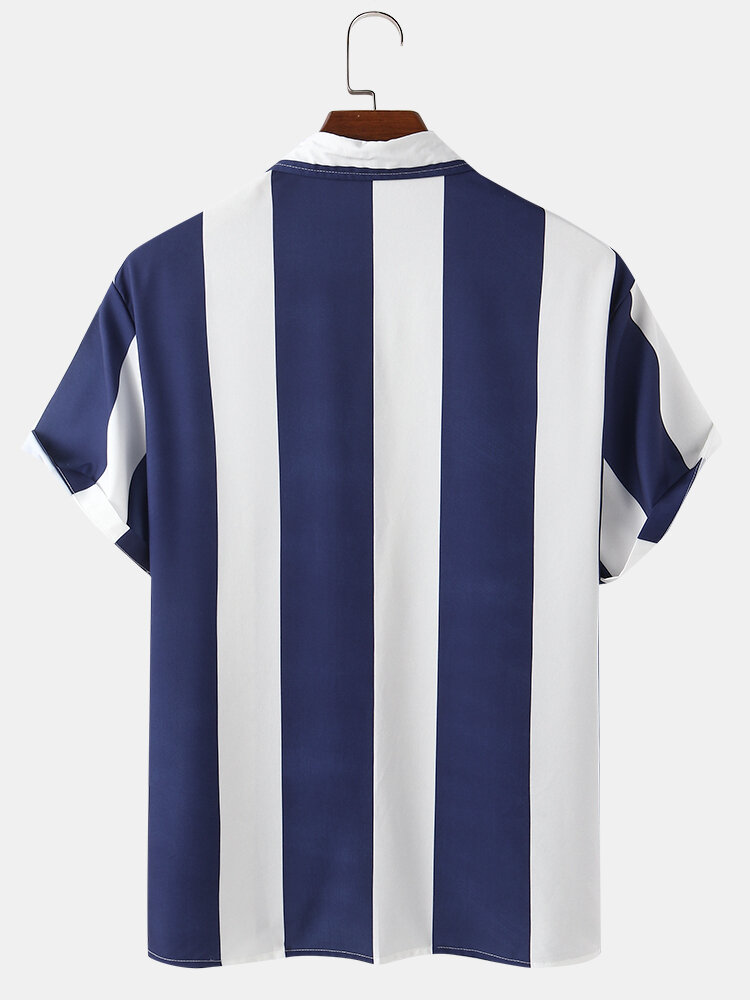 Wide Stripe Lane Print Casual Short Sleeve Shirts – Blue S