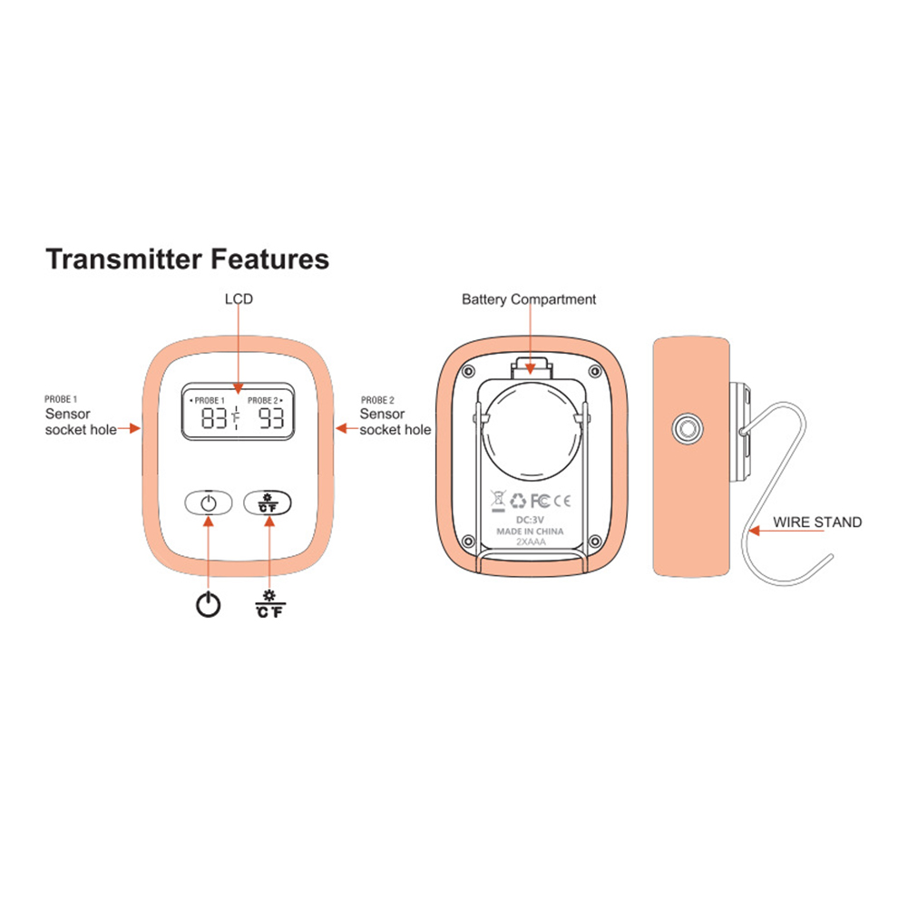 LCD Large screen clearly shows food and oven temperature; backlit display allows use in low light conditions With a decreasing tip design, enabling users to get readings more accurately and quickly, with an accuracy of 1.8F; the probe wire can withstand up to 716F The thermometer has count and countdown settings, ideal for long cooking or vegetable side dishes; the receiver will beep once it reaches the preset temperature